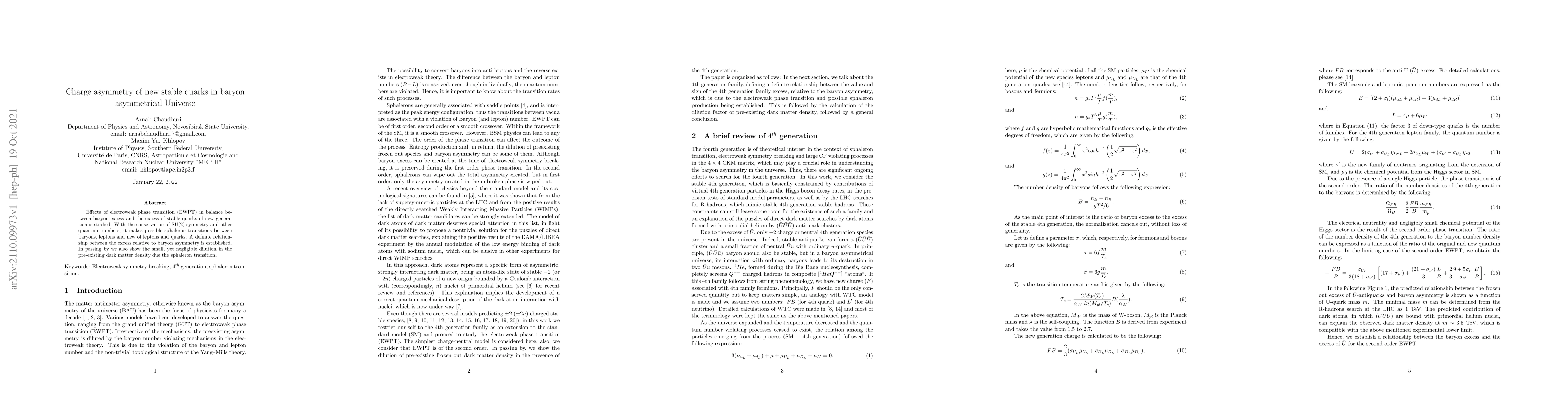 Effects of electroweak phase transition (EWPT) in balance between baryon excess and the excess of stable quarks of new generation is studied. With the conservation of SU(2) symmetry and other quantum numbers, it makes possible sphaleron transitions between baryons, leptons and new of leptons and quarks. A definite relationship between the excess relative to baryon asymmetry is established. In passing by we also show the small, yet negligible dilution in the pre-existing dark matter density due the sphaleron transition.