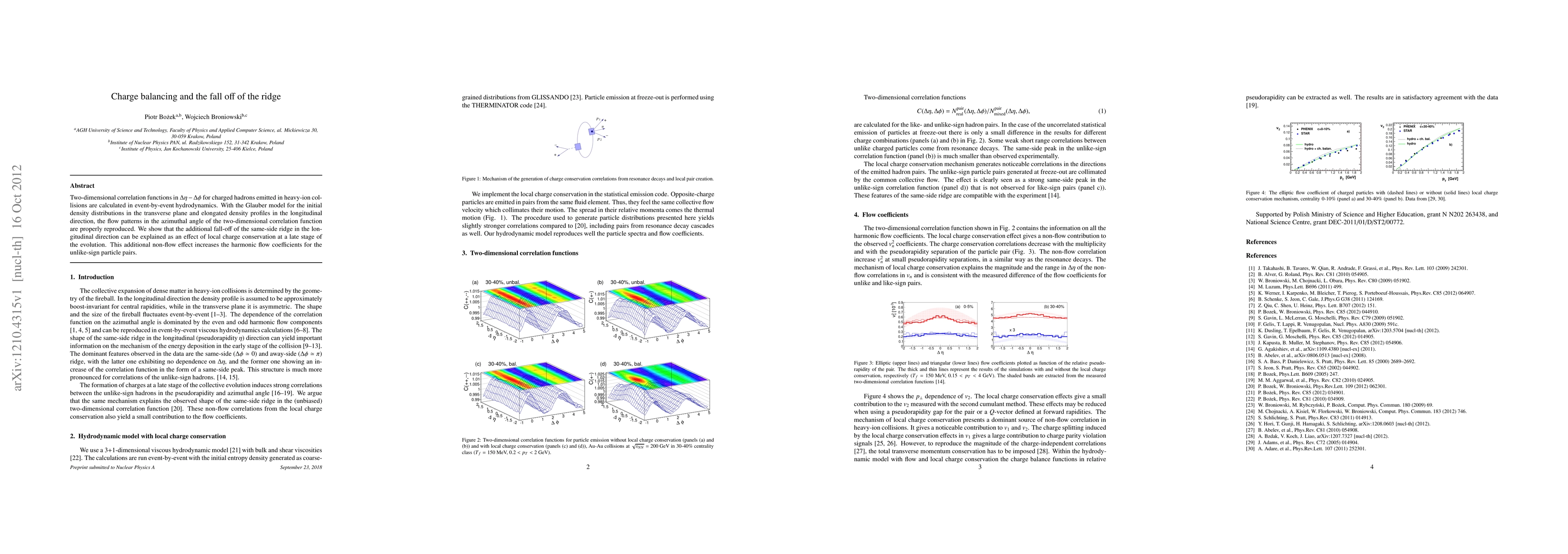 This study uses event-by-event hydrodynamics to analyze two-dimensional correlation functions in $\Delta\eta-\Delta \phi$ for charged hadrons in heavy-ion collisions, demonstrating that the fall-off of the same-side ridge in the longitudinal direction is due to local charge conservation at a late stage of the evolution, enhancing unlike-sign particle pairs' harmonic flow coefficients.