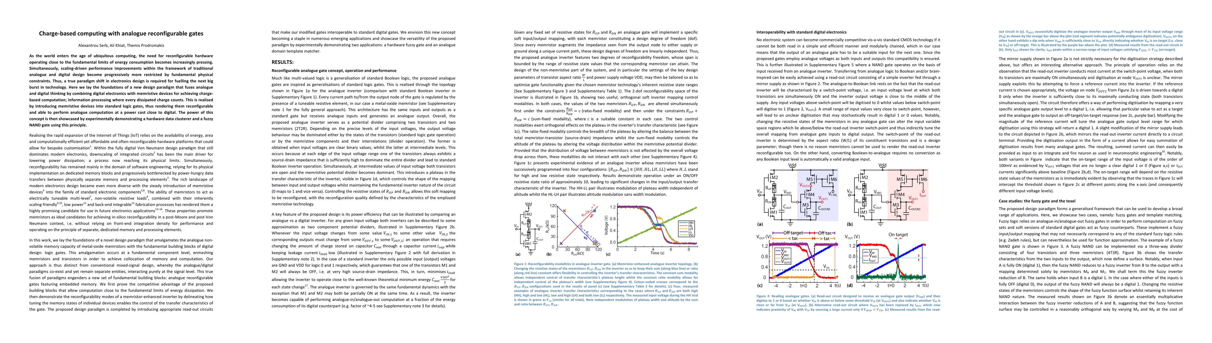 This paper proposes a new charge-based computing paradigm using analogue reconfigurable gates with memristive devices, aiming to achieve low-energy computation. It demonstrates a hardware data clusterer and a fuzzy NAND gate, showcasing the potential of this approach to overcome traditional scaling limitations in electronics design.