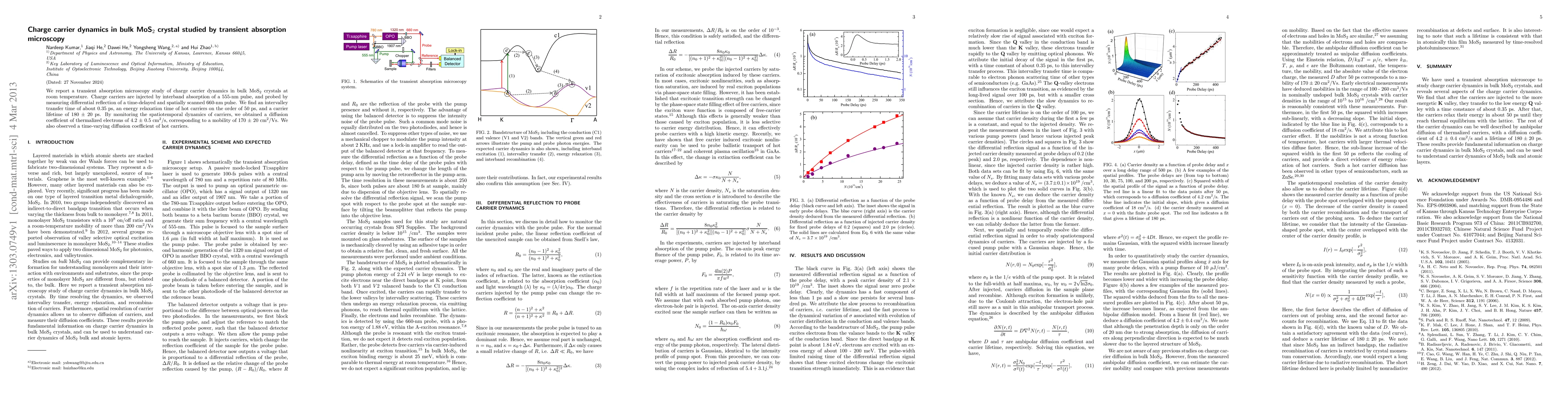 This study investigates charge carrier dynamics in bulk MoS2 crystals using transient absorption microscopy, revealing an intervalley transfer time of 0.35 ps, an energy relaxation time of 50 ps, and a carrier lifetime of 180 ps, along with a thermalized electron diffusion coefficient of 4.2 cm²/s and a mobility of 170 cm²/Vs.