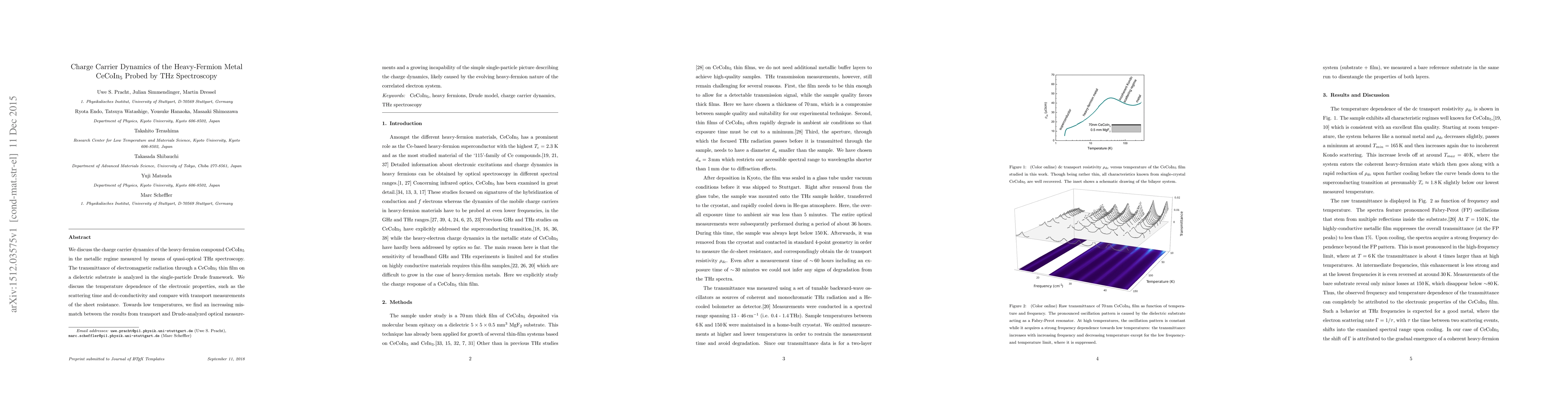 We discuss the charge carrier dynamics of the heavy-fermion compound CeCoIn$_5$ in the metallic regime measured by means of quasi-optical THz spectroscopy. The transmittance of electromagnetic radiation through a CeCoIn$_5$ thin film on a dielectric substrate is analyzed in the single-particle Drude framework. We discuss the temperature dependence of the electronic properties, such as the scattering time and dc-conductivity and compare with transport measurements of the sheet resistance. Towards low temperatures, we find an increasing mismatch between the results from transport and Drude-analyzed optical measurements and a growing incapability of the simple single-particle picture describing the charge dynamics, likely caused by the evolving heavy-fermion nature of the correlated electron system.