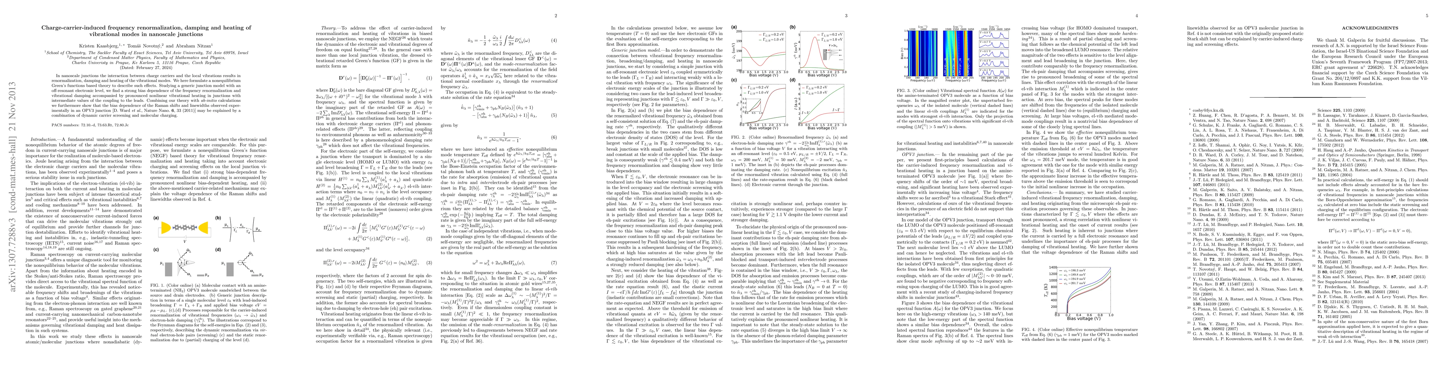 This paper develops a nonequilibrium Green's functions theory to describe how charge carriers in nanoscale junctions affect vibrational modes, leading to frequency renormalization, damping, and heating. The study reveals strong bias-dependent effects and nonlinear heating, supported by ab-initio calculations that explain experimental Raman shifts and linewidths in OPV3 junctions.