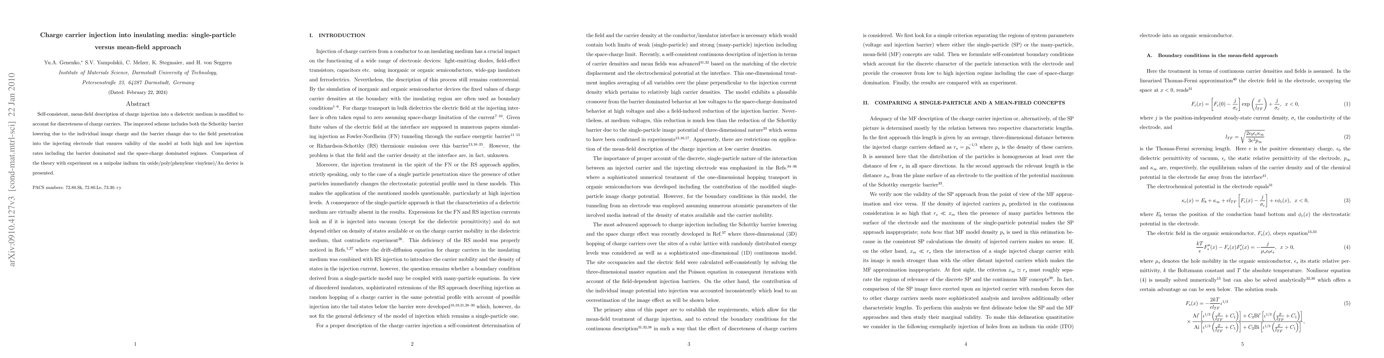 Self-consistent, mean-field description of charge injection into a dielectric medium is modified to account for discreteness of charge carriers. The improved scheme includes both the Schottky barrier lowering due to the individual image charge and the barrier change due to the field penetration into the injecting electrode that ensures validity of the model at both high and low injection rates including the barrier dominated and the space-charge dominated regimes. Comparison of the theory with experiment on an unipolar ITO/PPV/Au-device is presented.