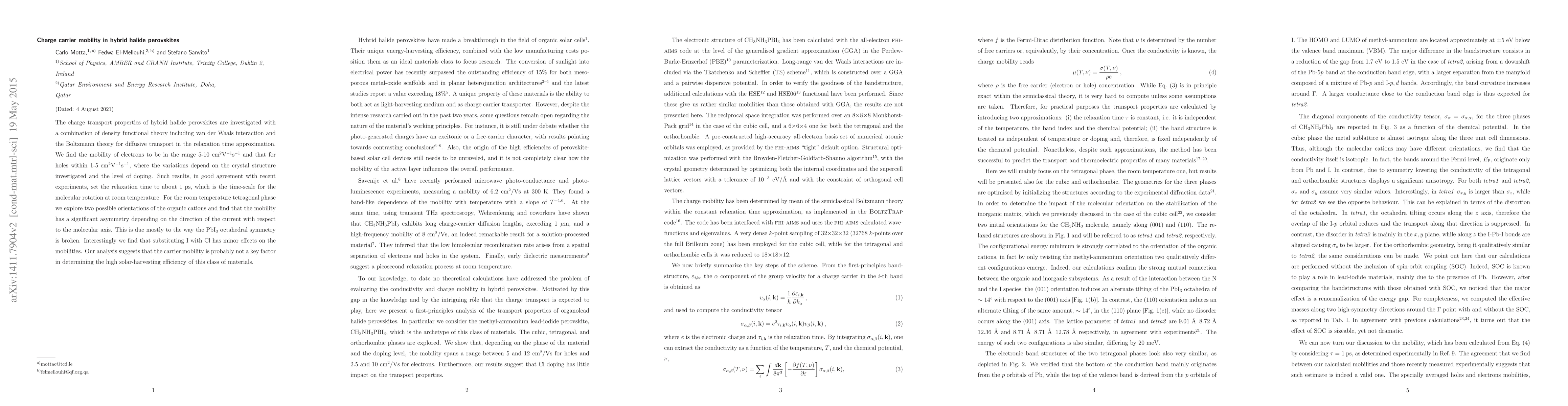 The paper combines density functional theory with Boltzmann transport theory to accurately predict charge carrier mobilities in hybrid halide perovskites, considering van der Waals interactions and molecular rotation effects.
