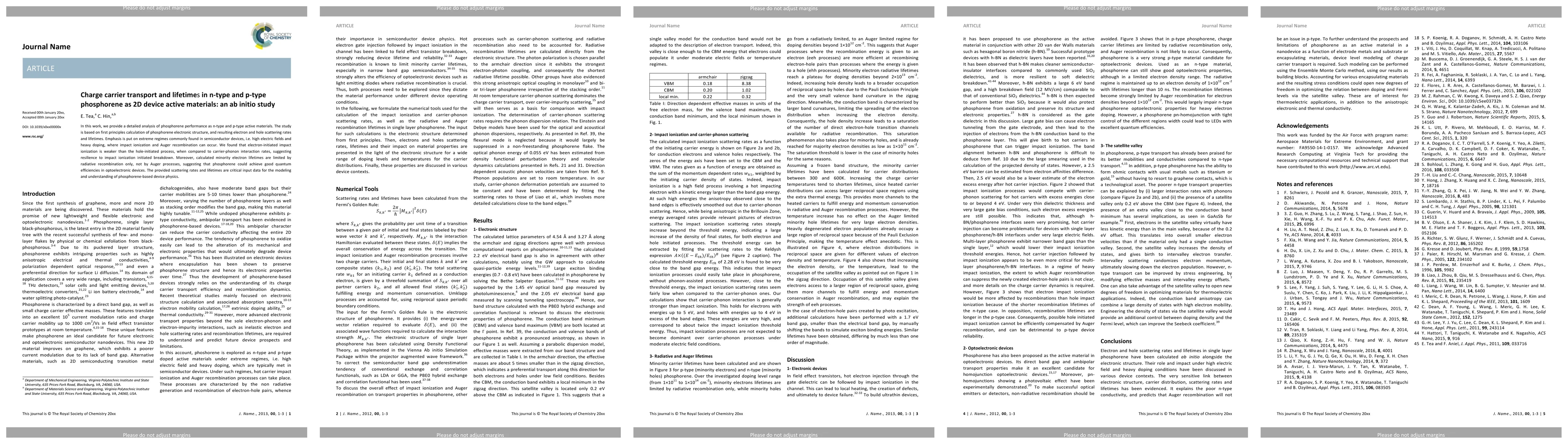 In this work, we provide a detailed analysis of phosphorene performance as n-type and p-type active materials. The study is based on first principles calculation of phosphorene electronic structure, and resulting electron and hole scattering rates and lifetimes. Emphasis is put on extreme regimes commonly found in semiconductor devices, i.e. high electric fields and heavy doping, where impact ionization and Auger recombination can occur. We found that electron-initiated impact ionization is weaker than the hole-initiated process, when compared to carrier-phonon interaction rates, suggesting resilience to impact ionization initiated breakdown. Moreover, calculated minority electron lifetimes are limited by radiative recombination only, not by Auger processes, suggesting that phosphorene could achieve good quantum efficiencies in optoelectronic devices. The provided scattering rates and lifetimes are critical input data for the modeling and understanding of phosphorene-based device physics.
