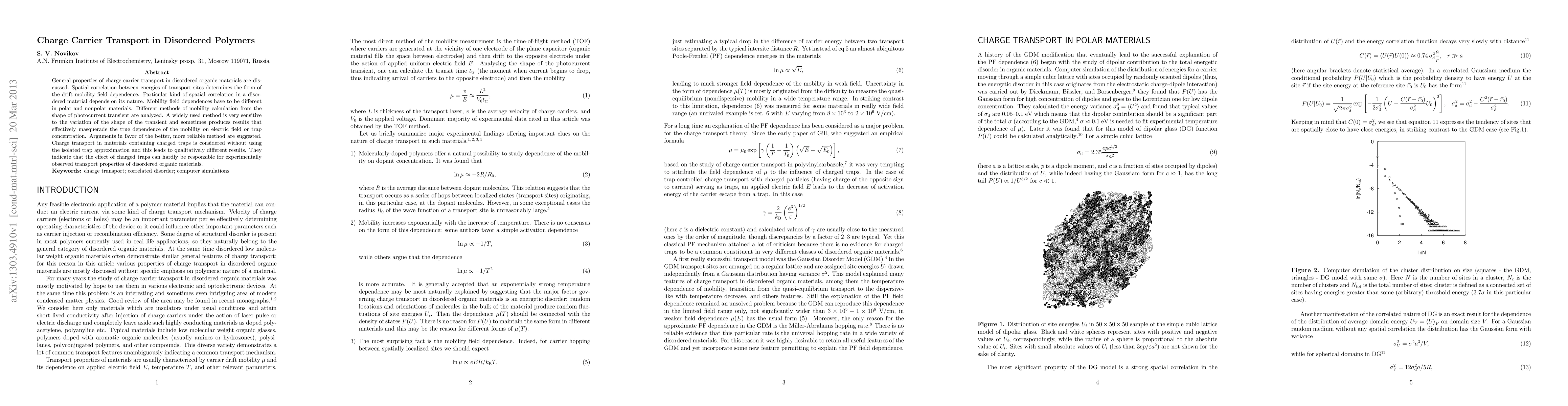 This paper discusses charge carrier transport in disordered organic polymers, emphasizing that spatial correlations between transport sites influence drift mobility. It argues that mobility field dependence varies between polar and nonpolar materials and critiques common methods for calculating mobility, advocating for a more reliable approach that considers charged traps without the isolated trap approximation, concluding that traps are unlikely to explain observed transport properties.
