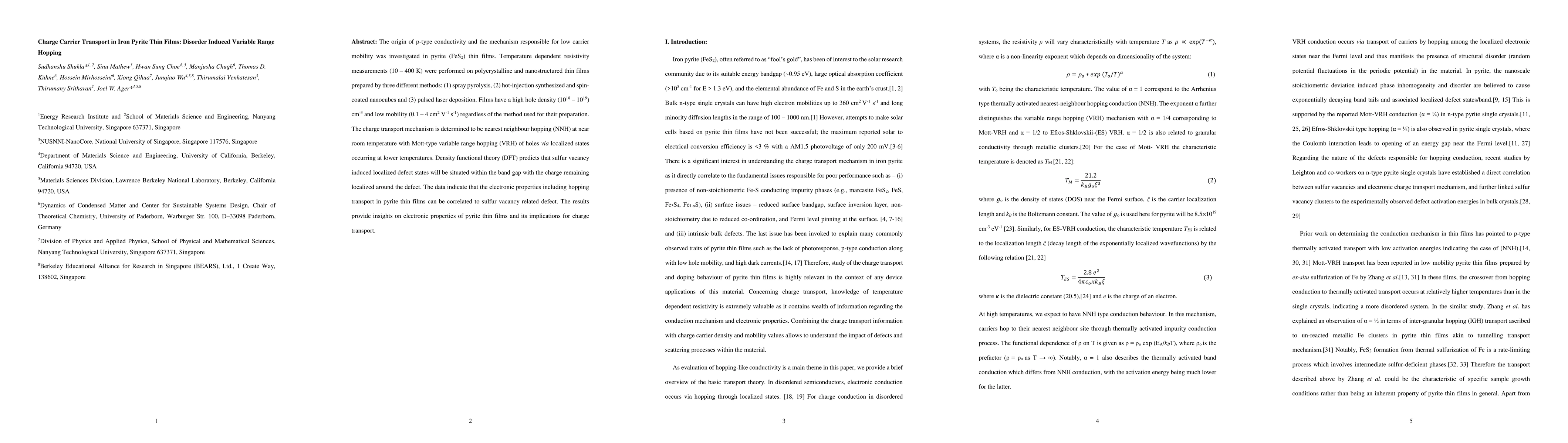 Summary: The study investigates the charge transport mechanism in iron pyrite (FeS2) thin films, finding that p-type conductivity and low carrier mobility are due to sulfur vacancy-induced localized defect states. The dominant charge transport mechanism is Mott-type variable range hopping, especially at lower temperatures.
