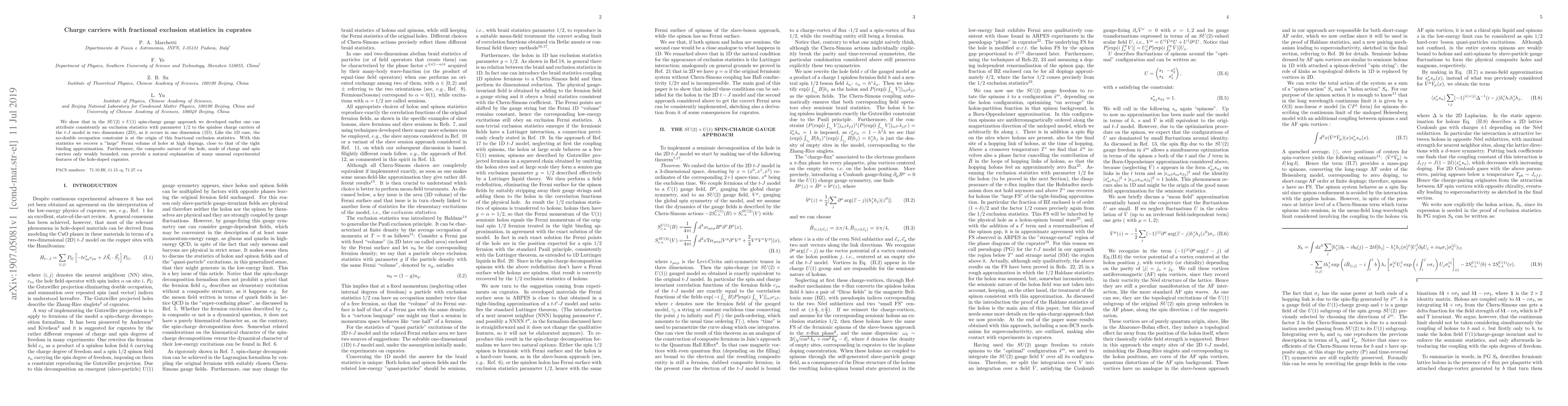 We show that in the SU(2)XU(1) spin-charge gauge approach we developed earlier one can attribute consistently an exclusion statistics with parameter 1/2 to the spinless charge carriers of the t-J model in two dimensions(2D), as it occurs in one dimension (1D). Like the 1D case, the no-double occupation constraint is at the origin of this fractional exclusion statistics. With this statistics we recover a "large" Fermi volume of holes at high dopings, close to that of the tight binding approximation. Furthermore, the composite nature of the hole, made of charge and spin carriers only weakly bounded, can provide a natural explanation of many unusual experimental features of the hole-doped cuprates.