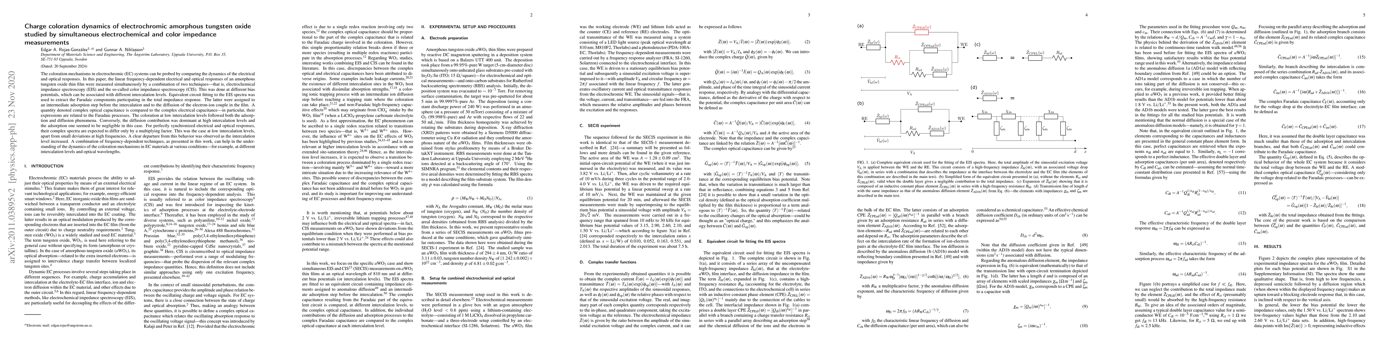 This research employs simultaneous electrochemical impedance spectroscopy (EIS) and color impedance spectroscopy (CIS) to study charge coloration dynamics in amorphous tungsten oxide. Findings indicate that at low intercalation levels, both adsorption and diffusion phenomena contribute to coloration, while diffusion dominates at high levels. The study reveals a departure from synchronized electrical and optical responses as intercalation increases, highlighting the utility of combined frequency-dependent techniques in understanding coloration mechanisms in electrochromic materials across various conditions.