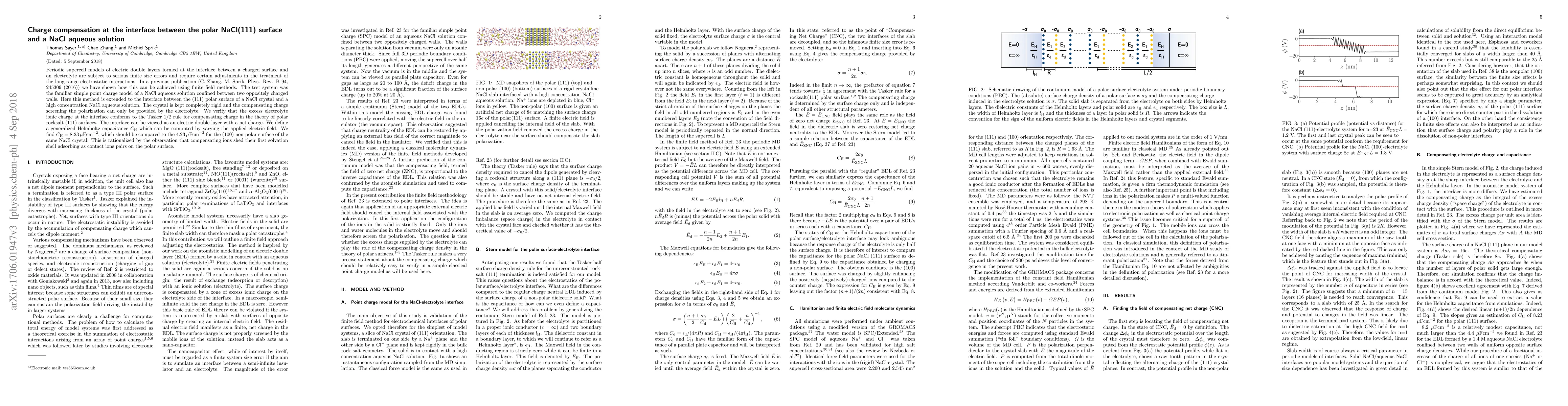 Periodic supercell models of electric double layers formed at the interface between a charged surface and an electrolyte are subject to serious finite size errors and require certain adjustments in the treatment of the long-range electrostatic interactions. In a previous publication (C. Zhang, M. Sprik, Phys. Rev. B 94, 245309 (2016)) we have shown how this can be achieved using finite field methods. The test system was the familiar simple point charge model of a NaCl aqueous solution confined between two oppositely charged walls. Here this method is extended to the interface between the (111) polar surface of a NaCl crystal and a high concentration NaCl aqueous solution. The crystal is kept completely rigid and the compensating charge screening the polarization can only be provided by the electrolyte. We verify that the excess electrolyte ionic charge at the interface conforms to the Tasker 1/2 rule for compensating charge in the theory of polar rocksalt (111) surfaces. The interface can be viewed as an electric double layer with a net charge. We define a generalized Helmholtz capacitance $C_\text{H}$ which can be computed by varying the applied electric field. We find $C_\text{H} = 8.23 \, \mu \mathrm{Fcm}^{-2}$, which should be compared to the $4.23 \, \mu \mathrm{Fcm}^{-2}$ for the (100) non-polar surface of the same NaCl crystal. This is rationalized by the observation that compensating ions shed their first solvation shell adsorbing as contact ions pairs on the polar surface.