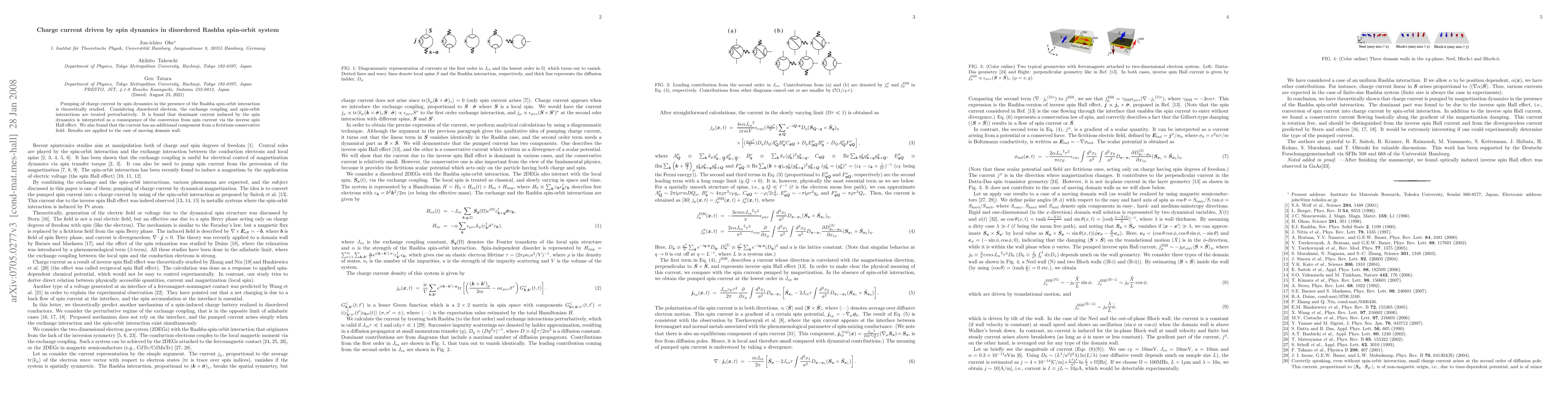 This paper theoretically explores how spin dynamics driven by Rashba spin-orbit interaction can induce charge current in disordered systems, attributing the current's dominance to spin current conversion via the inverse spin Hall effect, and identifying an additional current component from a fictitious conservative field. The findings are illustrated using the example of a moving domain wall.