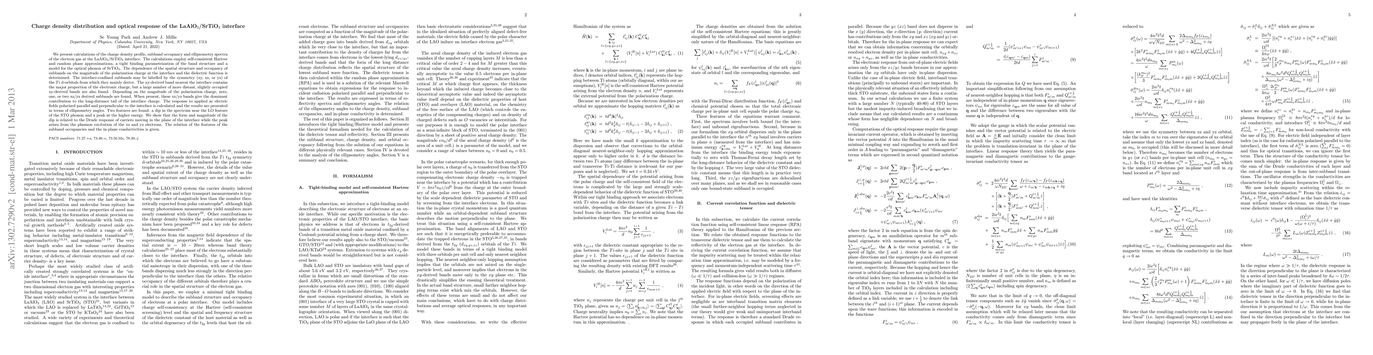 We present calculations of the charge density profile, subband occupancy and ellipsometry spectra of the electron gas at the LaAlO3/SrTiO3 interface. The calculations employ self-consistent Hartree and random phase approximations, a tight binding parametrization of the band structure and a model for the optical phonon of SrTiO3. The dependence of the spatial structure and occupancy of subbands on the magnitude of the polarization charge at the interface and the dielectric function is determined. The interface-confined subbands may be labelled by the symmetry (xy, xz, or yz) of the Ti d-orbitals from which they mainly derive. The xy-derived band nearest the interface contains the major proportion of the electronic charge, but a large number of more distant, slightly occupied xy-derived bands are also found. Depending on the magnitude of the polarization charge, zero, one, or two xz/yz derived subbands are found. When present, these xz/yz bands give the dominant contribution to the long-distance tail of the interface charge. The response to applied ac electric fields polarized parallel and perpendicular to the interface is calculated and the results are presented in terms of ellipsometry angles. Two features are found: a dip in the spectrum near the LO feature of the STO phonon and a peak at the higher energy. We show that the form and magnitude of the dip is related to the Drude response of carriers moving in the plane of the interface while the peak arises from the plasmon excitation of the xz and yz electrons. The relation of the features of the subband occupancies and the in-plane conductivities is given.