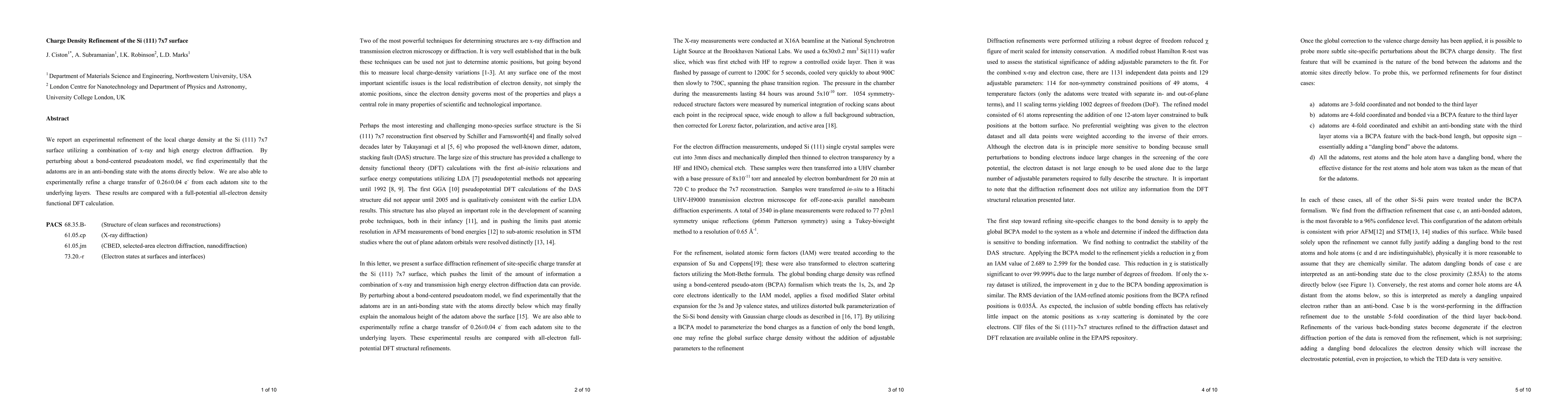 This study refines the local charge density of the Si (111) 7x7 surface using x-ray and electron diffraction, revealing adatoms in an anti-bonding state and a charge transfer of 0.26(4) e- per adatom to underlying layers, corroborated by DFT calculations.