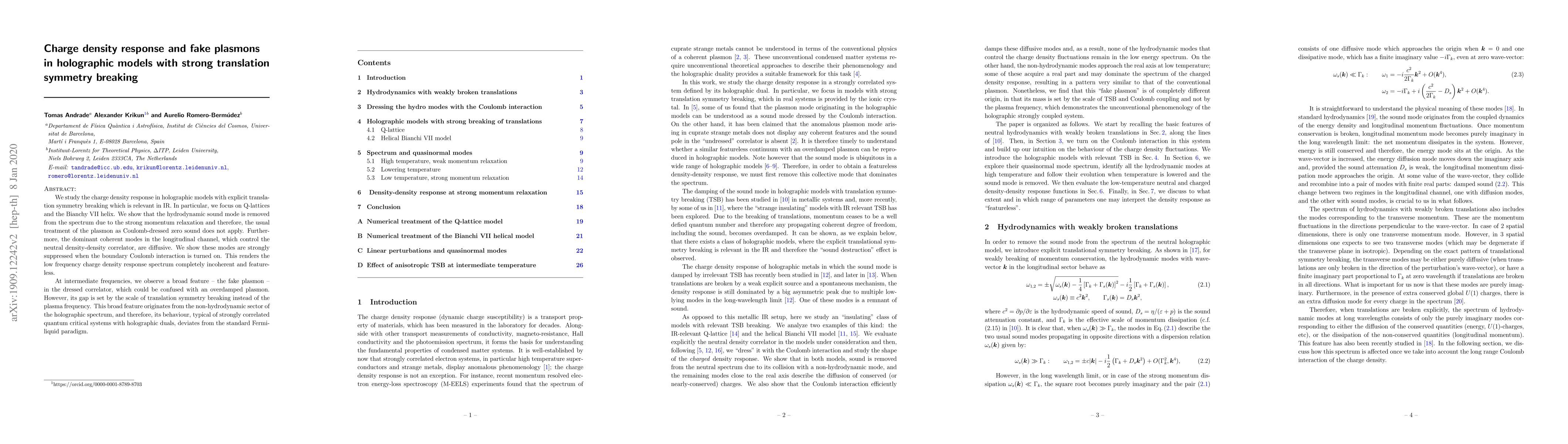 This paper investigates the charge density response in holographic models with strong translation symmetry breaking, revealing that the hydrodynamic sound mode is absent due to momentum relaxation. It identifies a "fake plasmon" at intermediate frequencies, which differs from a standard plasmon due to its gap being set by the scale of symmetry breaking rather than the plasma frequency, indicating a deviation from the Fermi-liquid paradigm.