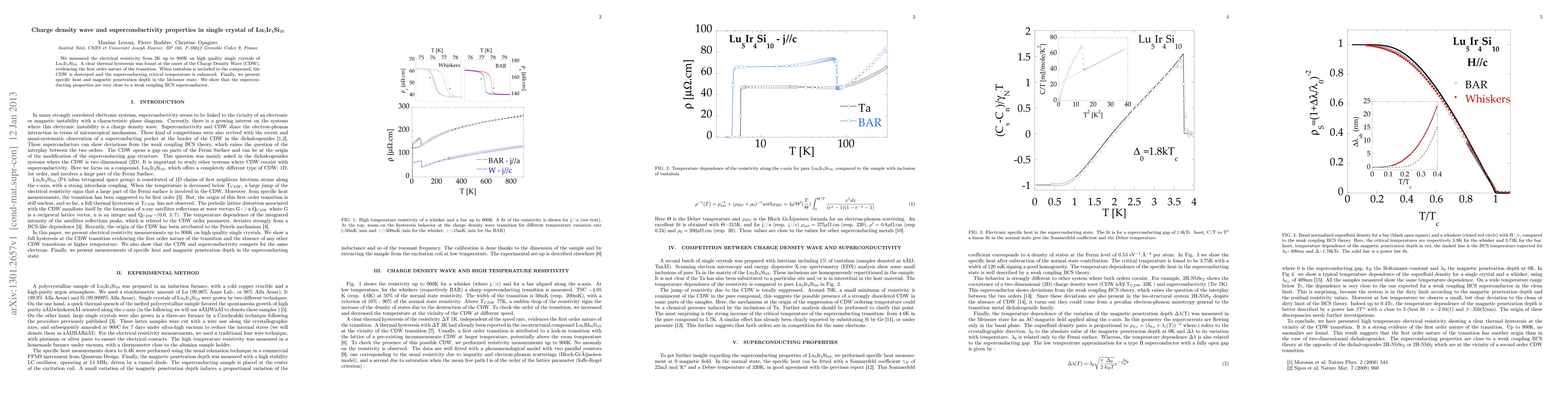 We measured the electrical resistivity from 2K up to 900K on high quality single crystals of Lu5Ir4Si10. A clear thermal hysteresis was found at the onset of the Charge Density Wave (CDW), evidencing the first order nature of the transition. When tantalum is included in the compound, the CDW is destroyed and the superconducting critical temperature is enhanced. Finally, we present specific heat and magnetic penetration depth in the Meissner state. We show that the superconducting properties are very close to a weak coupling BCS superconductor.