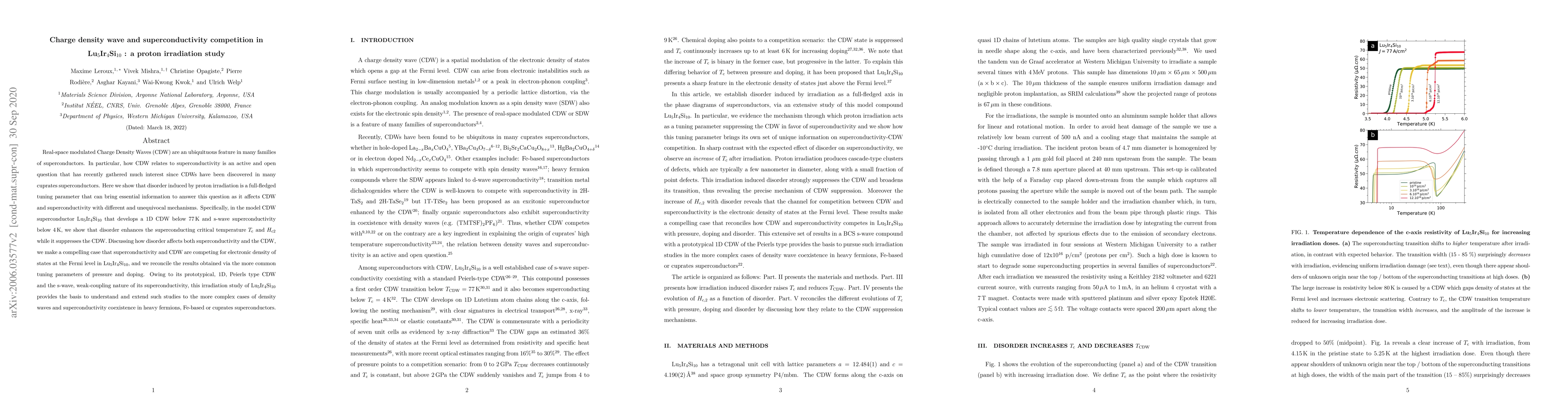 This study investigates how proton irradiation affects the competition between charge density waves (CDW) and superconductivity in Lu$_5$Ir$_4$Si$_{10}$. The results show that disorder enhances superconductivity while suppressing CDW, suggesting that both phenomena compete for the electronic density of states at the Fermi level.