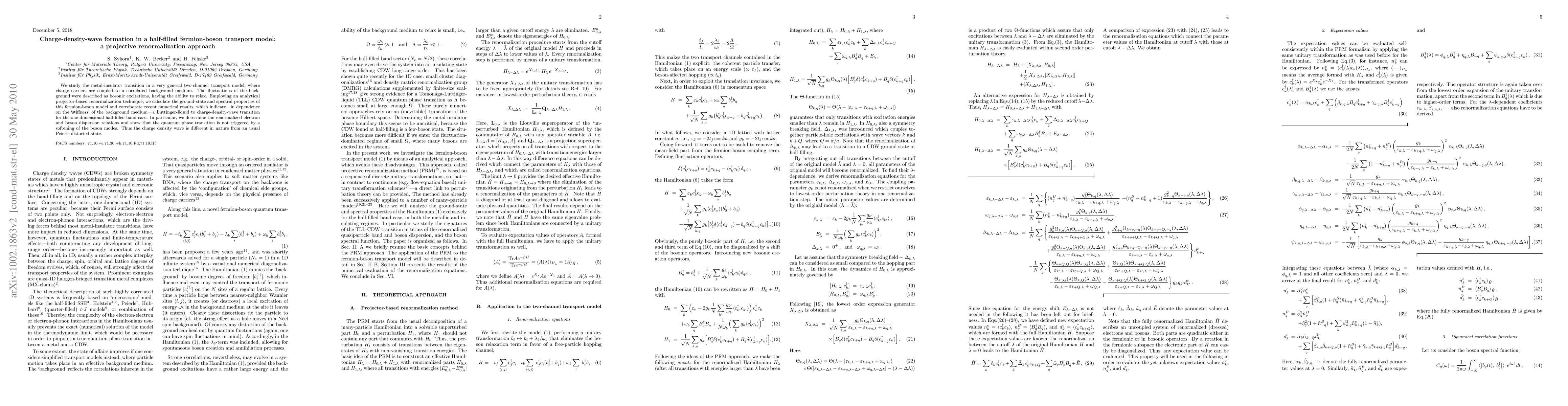 We study the metal-insulator transition in a very general two-channel transport model, where charge carriers are coupled to a correlated background medium. The fluctuations of the background were described as bosonic excitations, having the ability to relax. Employing an analytical projector-based renormalization technique, we calculate the ground-state and spectral properties of this fermion-boson model and corroborate recent numerical results, which indicate---in dependence on the `stiffness' of the background medium---a Luttinger-liquid to charge-density-wave transition for the one-dimensional half-filled band case. In particular, we determine the renormalized electron and boson dispersion relations and show that the quantum phase transition is not triggered by a softening of the boson modes. Thus the charge density wave is different in nature from an usual Peierls distorted state.