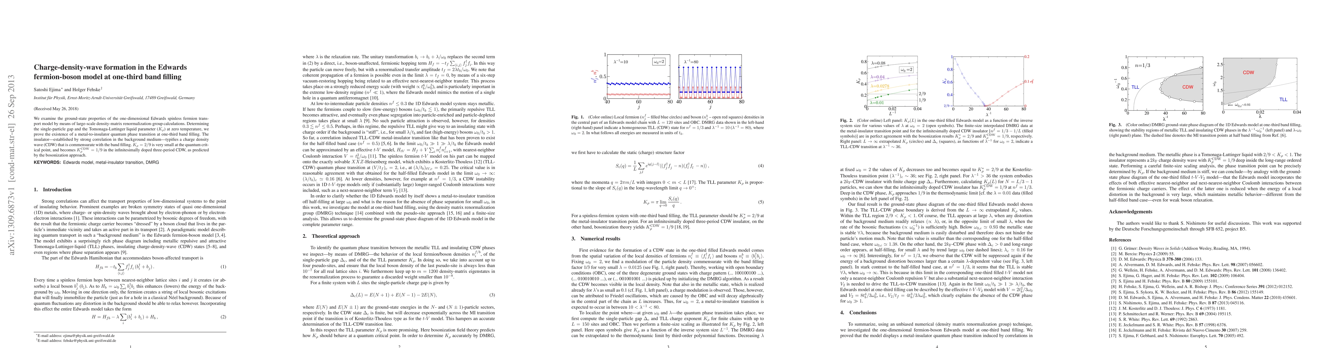 This paper investigates the ground-state properties of the one-dimensional Edwards fermion model using density-matrix renormalization-group calculations, revealing a metal-to-insulator quantum phase transition at one-third band filling, characterized by a commensurate charge-density wave. The Tomonaga-Luttinger liquid parameter is found to be very small at the critical point, supporting the formation of a three-period charge density wave.