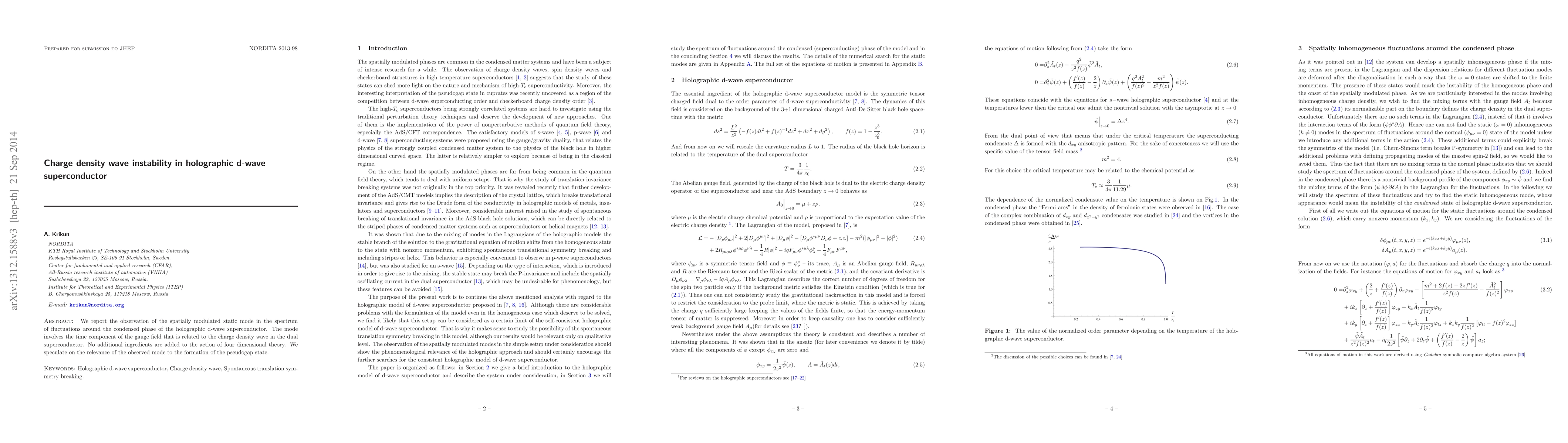 We report the observation of the spatially modulated static mode in the spectrum of fluctuations around the condensed phase of the holographic d-wave superconductor. The mode involves the time component of the gauge field that is related to the charge density wave in the dual superconductor. No additional ingredients are added to the action of five dimensional theory. We speculate on the relevance of the observed mode to the formation of the pseudogap state.