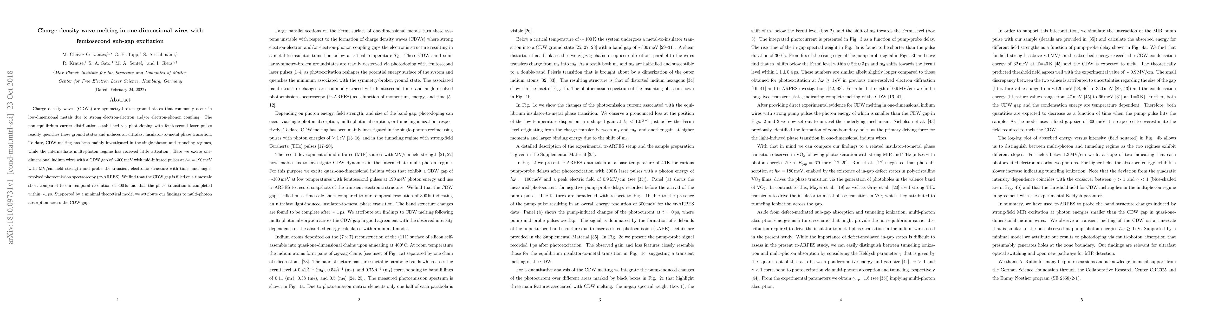 This study investigates the ultrafast melting of charge density waves in one-dimensional indium wires using femtosecond sub-gap excitations, revealing a rapid insulator-to-metal phase transition completed within ~1ps, attributed to multi-photon absorption across the CDW gap. Time- and angle-resolved photoemission spectroscopy confirms the filling of the CDW gap on a 300fs timescale.