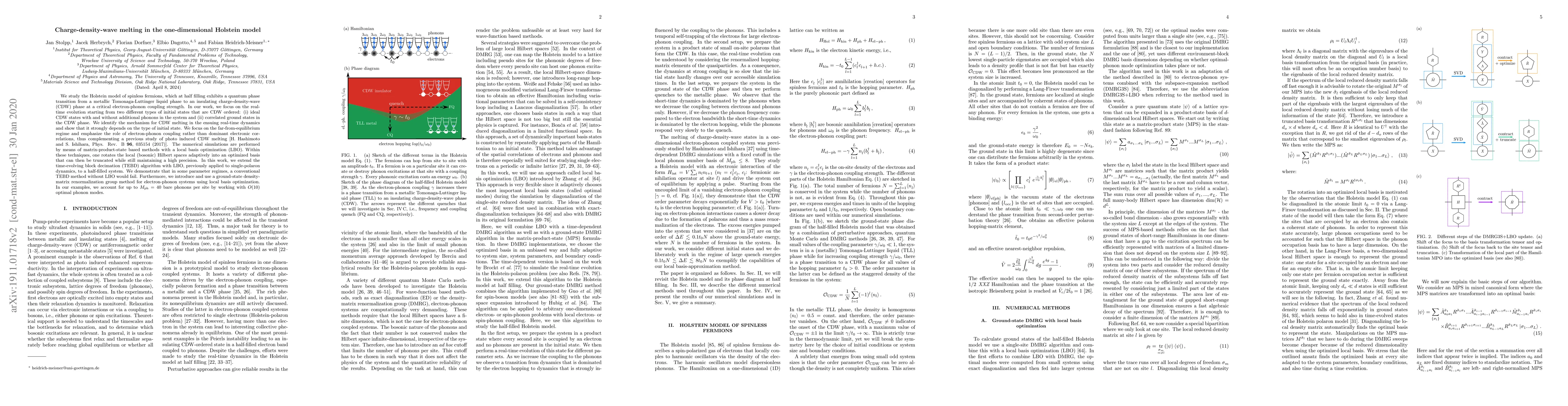 We study the Holstein model of spinless fermions, which at half-filling exhibits a quantum phase transition from a metallic Tomonaga-Luttinger liquid phase to an insulating charge-density-wave (CDW) phase at a critical electron-phonon coupling strength. In our work, we focus on the real-time evolution starting from two different types of initial states that are CDW ordered: (i) ideal CDW states with and without additional phonons in the system and (ii) correlated ground states in the CDW phase. We identify the mechanism for CDW melting in the ensuing real-time dynamics and show that it strongly depends on the type of initial state. We focus on the far-from-equilibrium regime and emphasize the role of electron-phonon coupling rather than dominant electronic correlations, thus complementing a previous study of photo-induced CDW melting [H. Hashimoto and S. Ishihara, Phys. Rev. B 96, 035154 (2017)]. The numerical simulations are performed by means of matrix-product-state based methods with a local basis optimization (LBO). Within these techniques, one rotates the local (bosonic) Hilbert spaces adaptively into an optimized basis that can then be truncated while still maintaining a high precision. In this work, we extend the time-evolving block decimation (TEBD) algorithm with LBO, previously applied to single-polaron dynamics, to a half-filled system. We demonstrate that in some parameter regimes, a conventional TEBD method without LBO would fail. Furthermore, we introduce and use a ground-state density-matrix renormalization group method for electron-phonon systems using local basis optimization. In our examples, we account for up to $M_{\rm ph} = 40$ bare phonons per site by working with $O(10)$ optimal phonon modes.