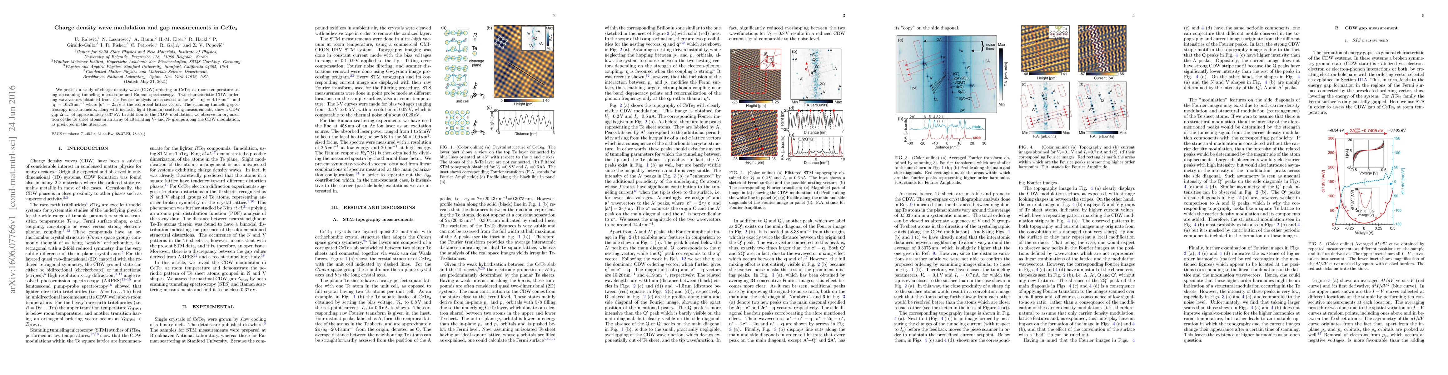 We present a study of charge density wave (CDW) ordering in CeTe$_3$ at room temperature using a scanning tunneling microscope and Raman spectroscopy. Two characteristic CDW ordering wavevectors obtained from the Fourier analysis are assessed to be $|{\bf \textbf{c}}^\ast-{\bf q}|=4.19\,{\rm nm}^{-1}$ and $|{\bf q}|=10.26\,{\rm nm}^{-1}$ where $|{\bf c}^\ast| = 2\pi/c$ is the reciprocal lattice vector. The scanning tunneling spectroscopy measurements, along with inelastic light (Raman) scattering measurements, show a CDW gap $\Delta_{\rm max}$ of approximately 0.37 eV. In addition to the CDW modulation, we observe an organization of the Te sheet atoms in an array of alternating V- and N- groups along the CDW modulation, as predicted in the literature.