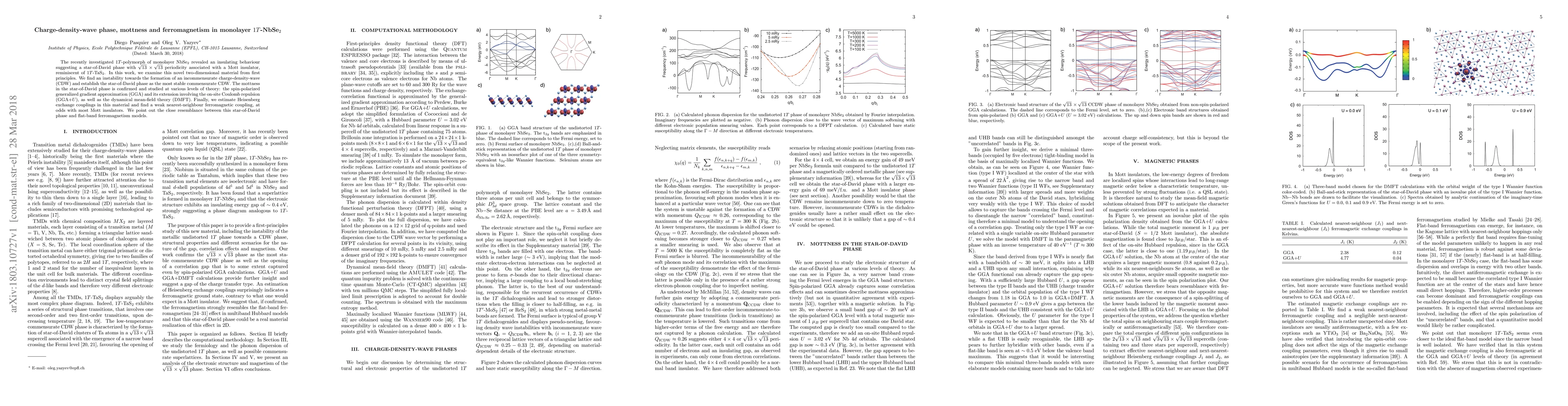 The recently investigated $1T$-polymorph of monolayer NbSe$_2$ revealed an insulating behaviour suggesting a star-of-David phase with $\sqrt{13}\,\times\sqrt{13}$ periodicity associated with a Mott insulator, reminiscent of $1T$-TaS$_2$. In this work, we examine this novel two-dimensional material from first principles. We find an instability towards the formation of an incommensurate charge-density-wave (CDW) and establish the star-of-David phase as the most stable commensurate CDW. The mottness in the star-of-David phase is confirmed and studied at various levels of theory: the spin-polarized generalized gradient approximation (GGA) and its extension involving the on-site Coulomb repulsion (GGA+$U$), as well as the dynamical mean-field theory (DMFT). Finally, we estimate Heisenberg exchange couplings in this material and find a weak nearest-neighbour ferromagnetic coupling, at odds with most Mott insulators. We point out the close resemblance between this star-of-David phase and flat-band ferromagnetism models.
