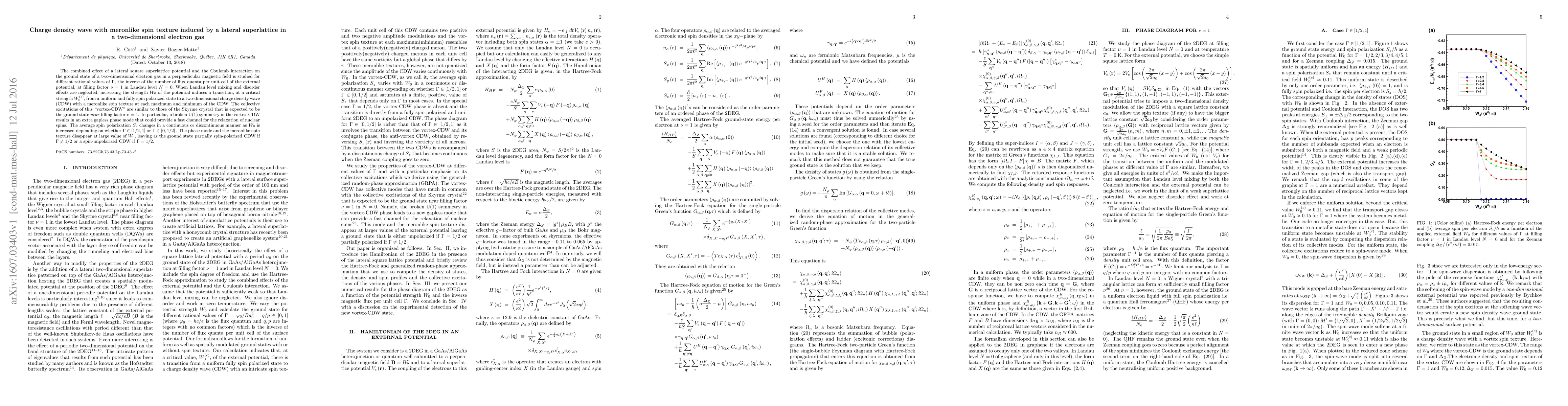 This study investigates the ground state of a 2D electron gas under a lateral superlattice and magnetic field, revealing a transition from a spin-polarized state to a charge density wave with a meronlike spin texture. The transition depends on the superlattice strength and the ratio of flux quanta per unit cell, leading to unique collective excitations and spin polarization behavior.