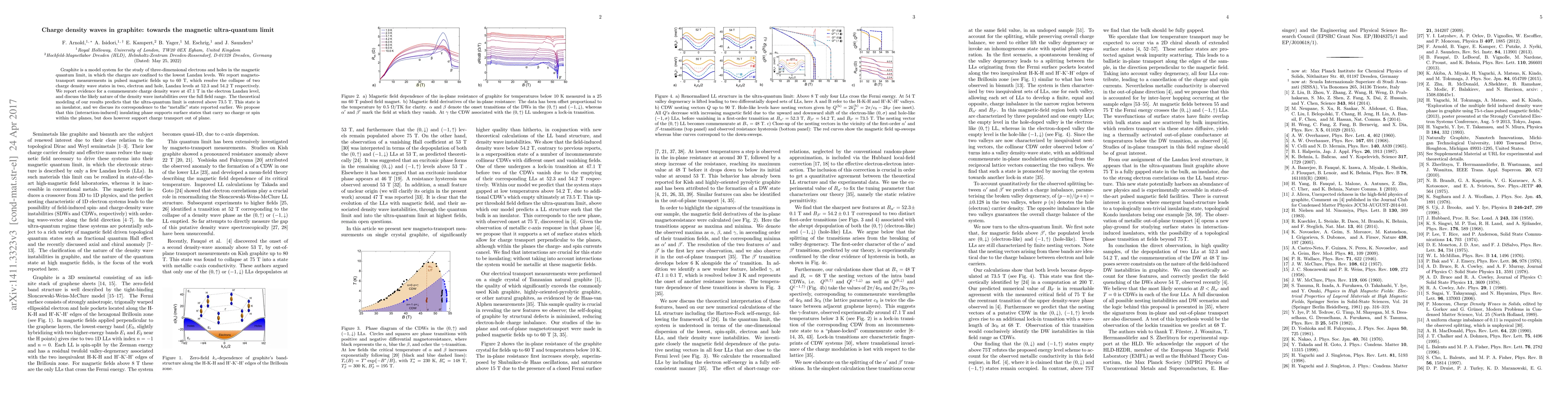 Graphite is a model system for the study of three-dimensional electrons and holes in the magnetic quantum limit, in which the charges are confined to the lowest Landau levels. We report magneto-transport measurements in pulsed magnetic fields up to 60 T, which resolve the collapse of two density wave states in two, electron and hole, Landau levels at 52.3 and 54.2 T respectively. We report evidence for a commensurate density wave at 47.1 T in the electron Landau level. The theoretical modelling of these results predicts that the ultra-quantum limit is entered above 73.5 T. This state is an insulator, and we discuss its correspondence to the "metallic" state reported earlier. We propose that this (interaction-induced) insulating phase supports surface states that carry no charge or spin within the planes, but does however support charge transport out of plane.