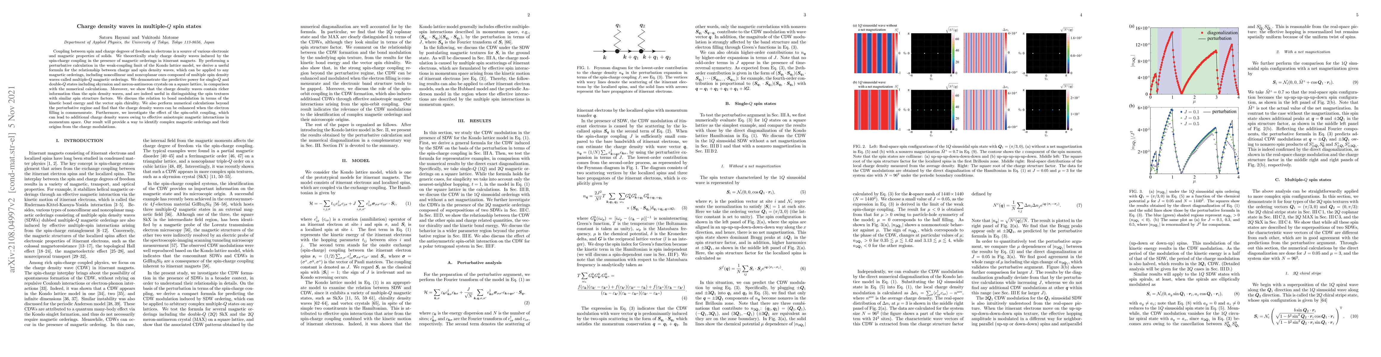 This paper theoretically investigates charge density waves (CDWs) induced by spin-charge coupling in itinerant magnets, deriving a formula applicable to multiple-$Q$ magnetic orderings. It demonstrates the predictive power of CDWs in distinguishing complex spin textures and discusses their relation to bond modulation and spin-orbit coupling effects.
