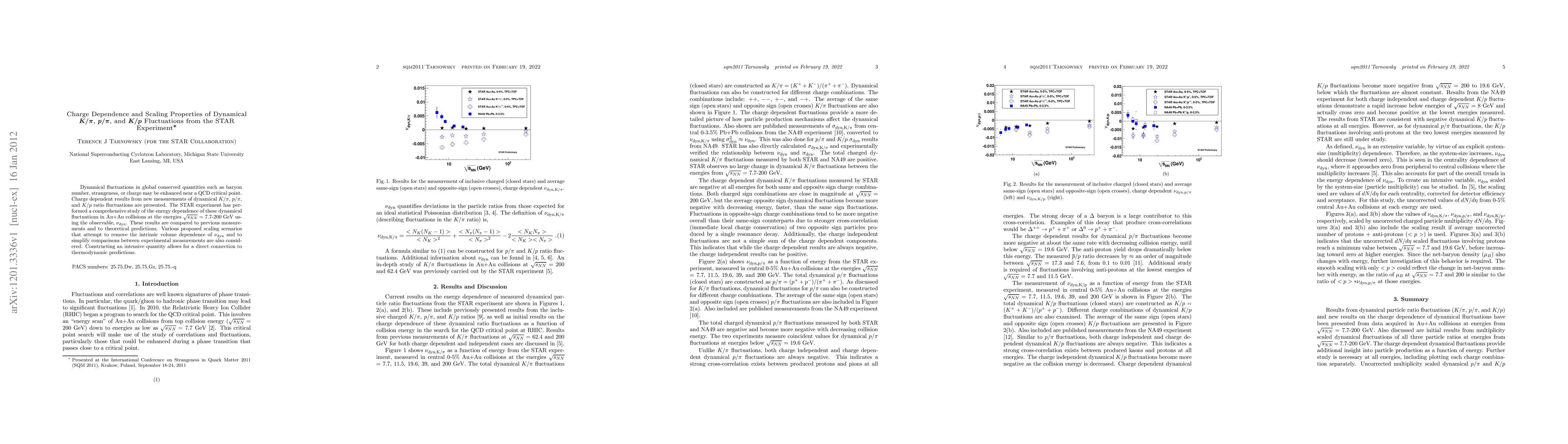Dynamical fluctuations in global conserved quantities such as baryon number, strangeness, or charge may be enhanced near a QCD critical point. Charge dependent results from new measurements of dynamical $K/\pi$, $p/\pi$, and $K/p$ ratio fluctuations are presented. The STAR experiment has performed a comprehensive study of the energy dependence of these dynamical fluctuations in Au+Au collisions at the energies $\sqrt{s_{NN}}$ = 7.7-200 GeV using the observable, $\nu_{\rm dyn}$. These results are compared to previous measurements and to theoretical predictions. Various proposed scaling scenarios that attempt to remove the intrinsic volume dependence of $\nu_{\rm dyn}$ and to simplify comparisons between experimental measurements are also considered. Constructing an intensive quantity allows for a direct connection to thermodynamic predictions.
