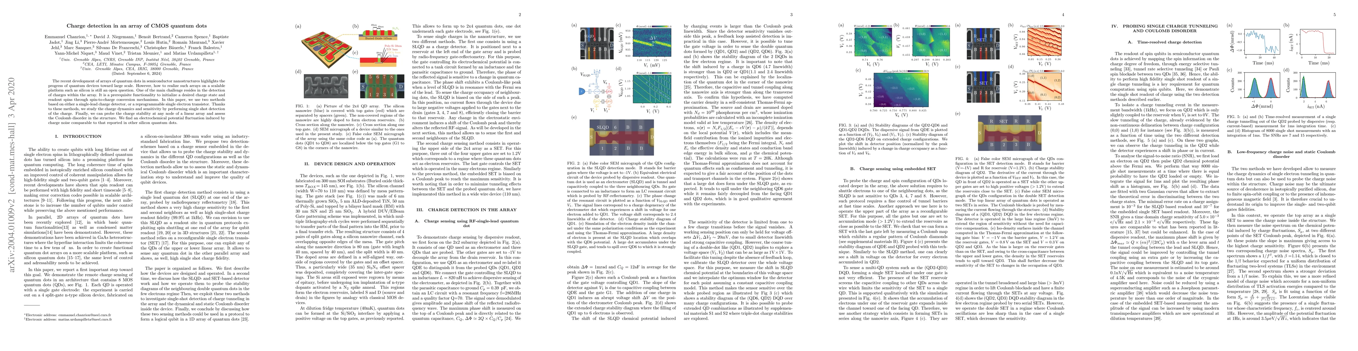 This paper explores charge detection in CMOS quantum dot arrays using single-lead charge detectors and reprogrammable single electron transistors, enabling single shot detection and analysis of charge dynamics, stability, and Coulomb disorder, revealing electrochemical potential fluctuations similar to those in other silicon quantum dots.