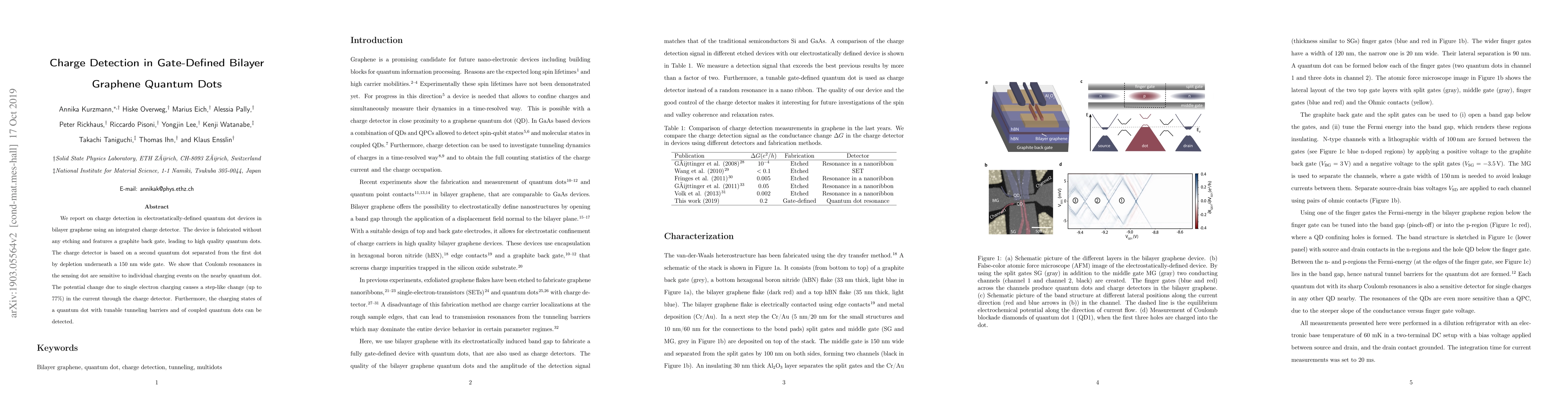 This study presents a novel charge detection method in bilayer graphene quantum dots via an integrated detector, demonstrating significant current changes in response to individual electron charging events. The setup uses a second quantum dot for sensing, showing sensitivity to the charge state of nearby quantum dots and enabling detection of charging states in tunable and coupled quantum dot systems.