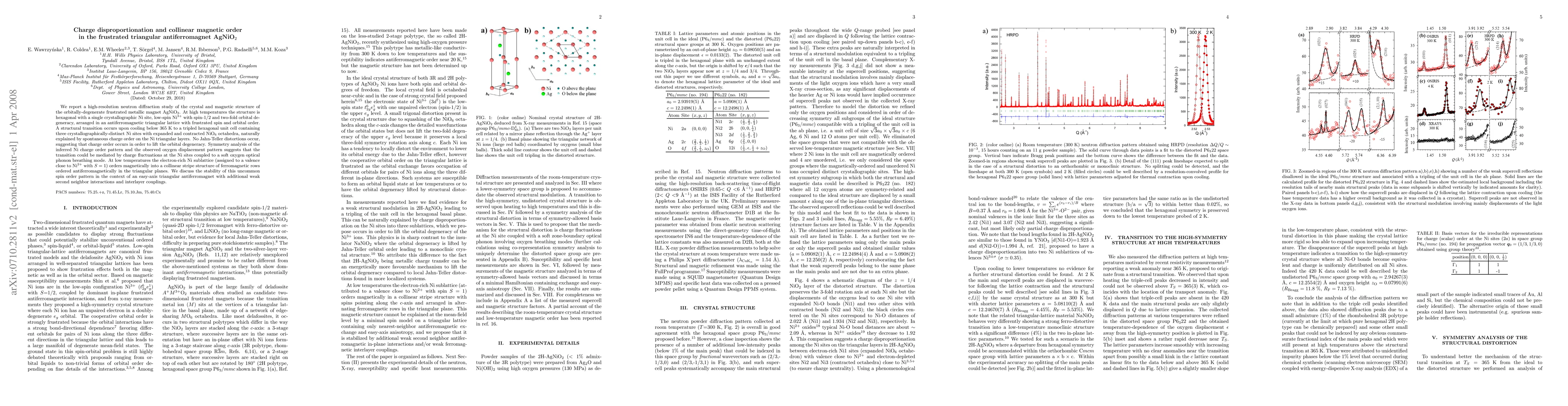 This study reveals that AgNiO2 undergoes a structural transition below 365 K, resulting in charge disproportionation among Ni sites and a magnetic order in the form of collinear magnetic stripes. The charge order lifts orbital degeneracy without Jahn-Teller distortions, suggesting a coupling to an oxygen phonon mode.