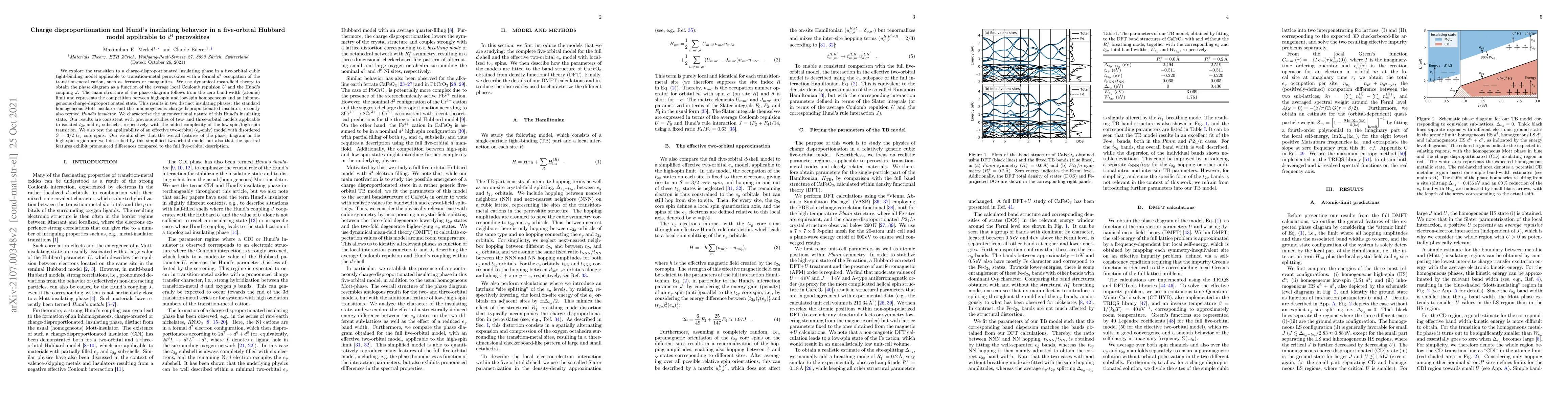 Researchers studied a five-orbital model applicable to d^4 perovskites using dynamical mean-field theory to explore charge disproportionation and Hund's insulating behavior, finding two distinct insulating phases with unique characteristics.