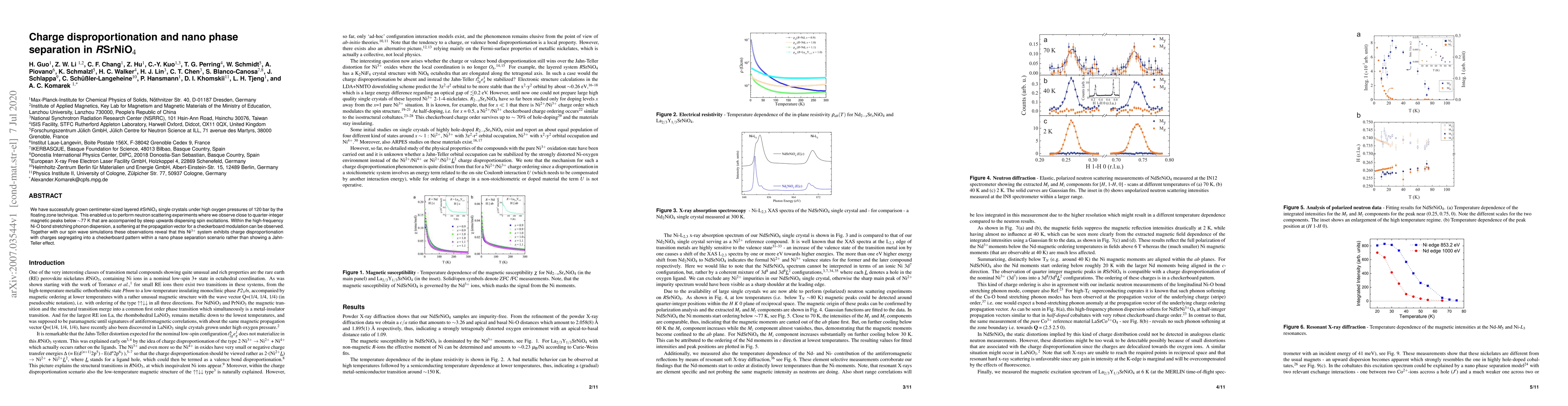 We have successfully grown centimeter-sized layered $R$SrNiO$_4$ single crystals under high oxygen pressures of 120 bar by the floating zone technique. This enabled us to perform neutron scattering experiments where we observe close to quarter-integer magnetic peaks below $\sim$77 K that are accompanied by steep upwards dispersing spin excitations. Within the high-frequency Ni-O bond stretching phonon dispersion, a softening at the propagation vector for a checkerboard modulation can be observed. Together with our spin wave simulations these observations reveal that this Ni$^{3+}$ system exhibits charge disproportionation with charges segregating into a checkerboard pattern within a nano phase separation scenario rather than showing a Jahn-Teller effect.