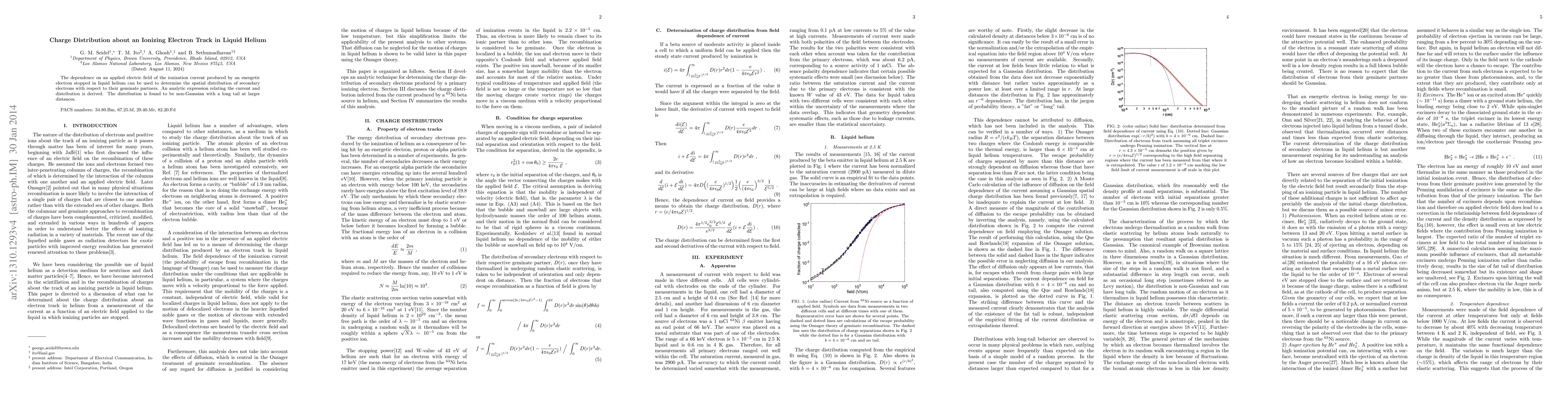 The dependence on an applied electric field of the ionization current produced by an energetic electron stopped in liquid helium can be used to determine the spatial distribution of secondary electrons with respect to their geminate partners. An analytic expression relating the current and distribution is derived. The distribution is found to be non-Gaussian with a long tail at larger distances.