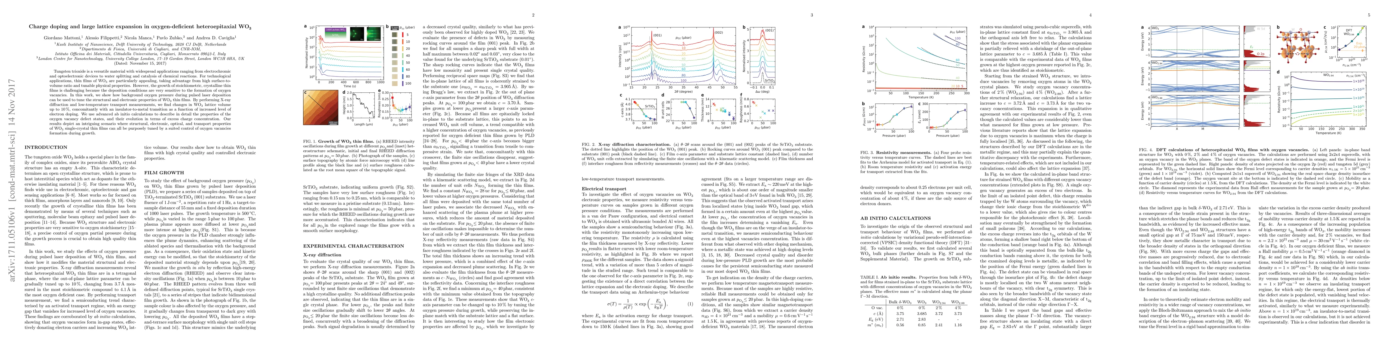 This study demonstrates how adjusting background oxygen pressure during pulsed laser deposition can tune the structural and electronic properties of WO3 thin films, leading to significant lattice expansion and an insulator-to-metal transition via charge doping. Advanced calculations reveal the impact of oxygen vacancies on defect states and charge concentration, showing potential for tailoring WO3 properties for various applications.