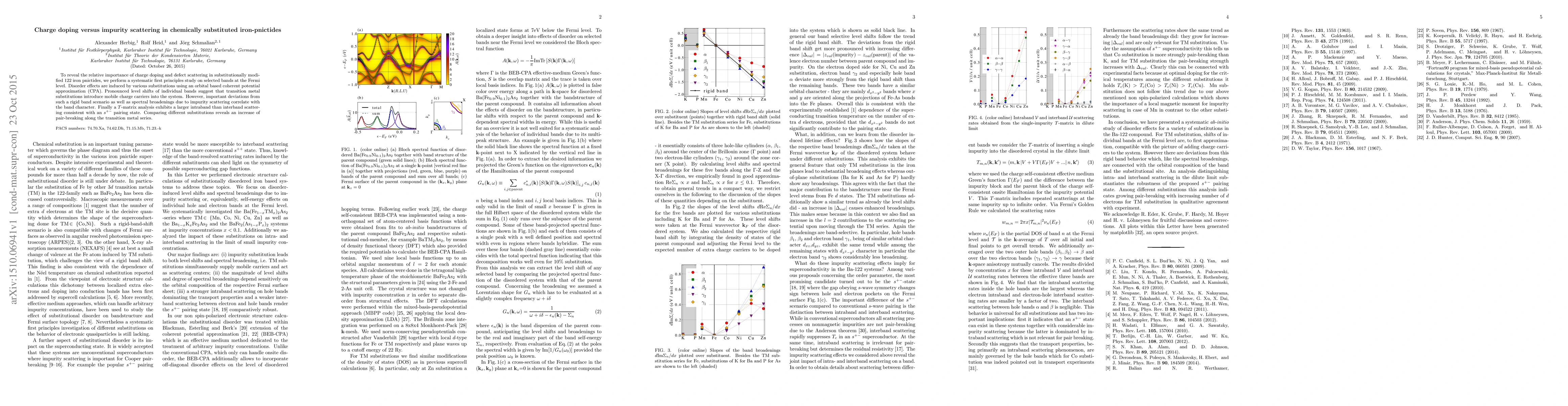 To reveal the relative importance of charge doping and defect scattering in substitutionally modified 122 iron pnictides, we perform a systematic first principles study on selected bands at the Fermi level. Disorder effects are induced by various substitutions using an orbital based coherent potential approximation (CPA). Pronounced level shifts of individual bands suggest that transition metal substitutions introduce mobile charge carriers into the system. However, important deviations from such a rigid band scenario as well as spectral broadenings due to impurity scattering correlate with the band character. Finally a $T$-matrix analysis exhibits a larger intraband than interband scattering consistent with an $s^{+-}$ pairing state. Comparing different substitutions reveals an increase of pair-breaking along the transition metal series.
