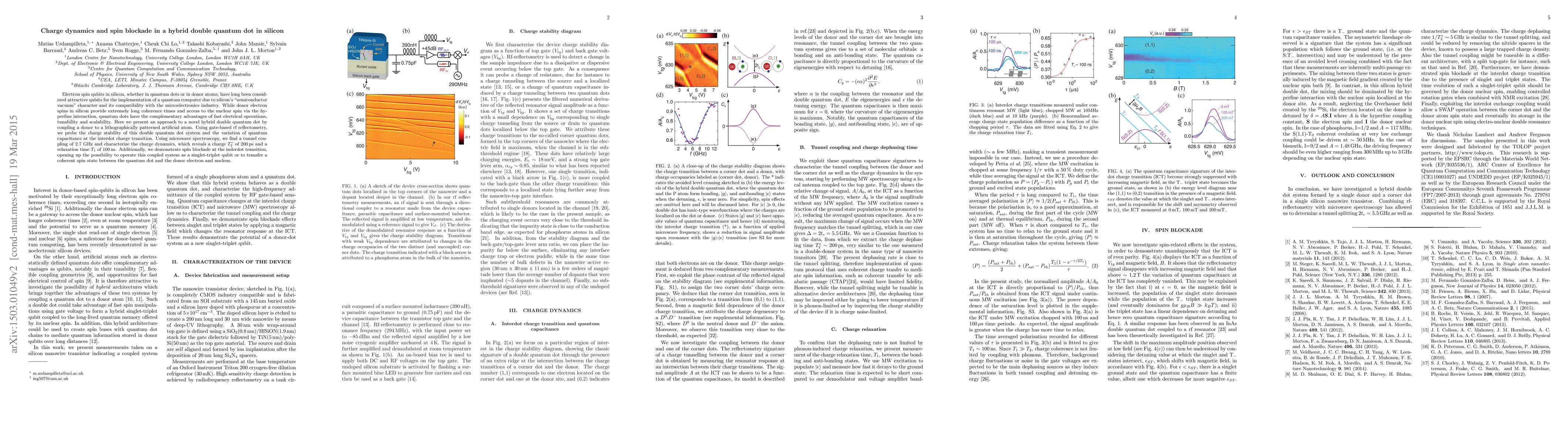 This paper investigates a hybrid double quantum dot in silicon, combining the long coherence times of donor electron spins with the fast electrical operations of quantum dots. The study uses reflectometry and microwave spectroscopy to explore charge dynamics, revealing a tunnel coupling of 2.7 GHz, a charge T2* of 200 ps, and a T1 relaxation time of 100 ns, while demonstrating spin blockade, which allows for singlet-triplet qubit operation or spin state transfer.