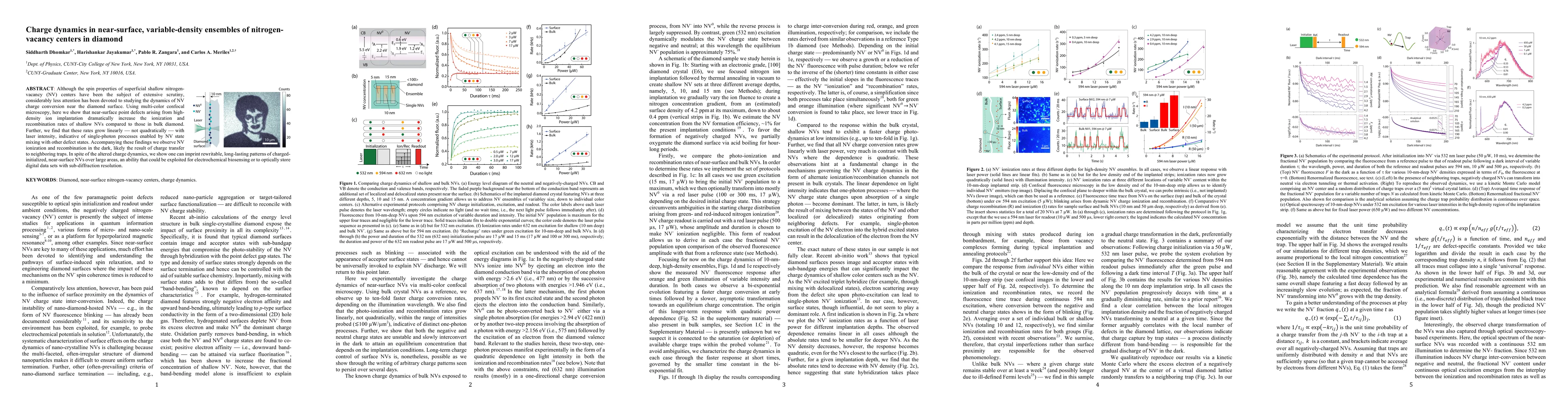 This paper investigates the charge dynamics of nitrogen-vacancy centers in diamond near the surface, revealing that high-density ion implantation increases ionization and recombination rates. The study finds these rates grow linearly with laser intensity, suggesting single-photon processes and charge transfer to neighboring traps, while enabling rewritable, long-lasting patterns for potential applications in biosensing and data storage.