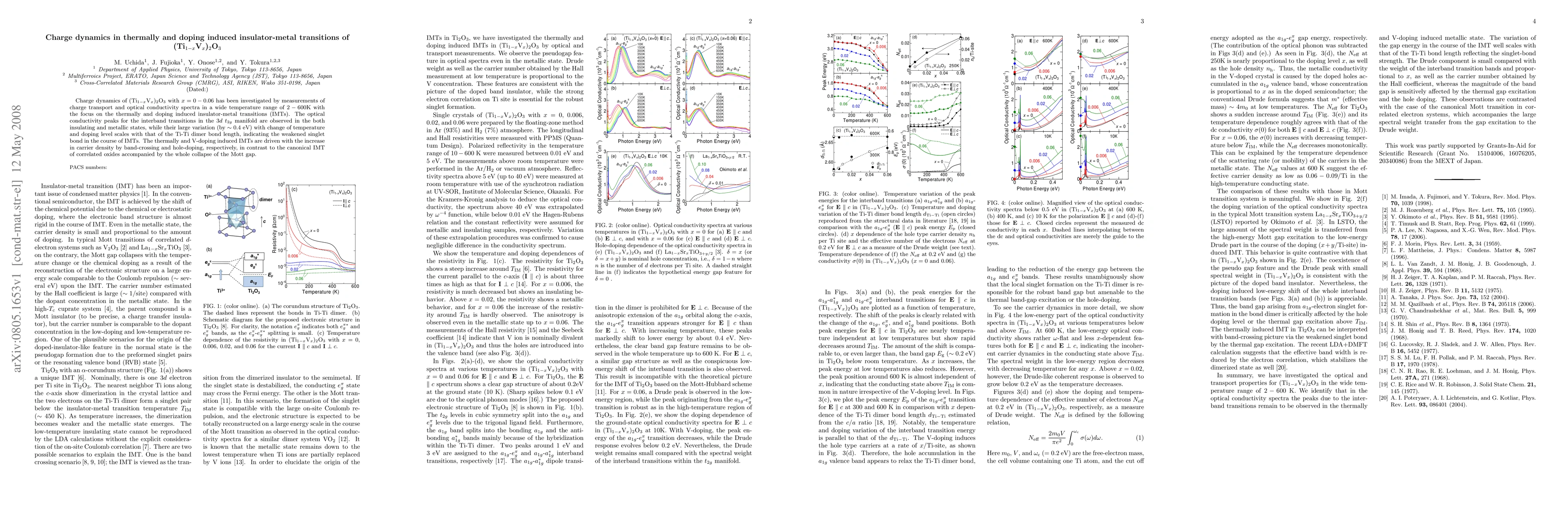 This paper investigates the charge dynamics in (Ti1-xVx)2O3 during thermally and doping-induced insulator-metal transitions, revealing changes in optical conductivity and interband transitions linked to the Ti-Ti dimer bond length. The transitions are driven by band-crossing and hole-doping, differing from typical Mott gap collapse.