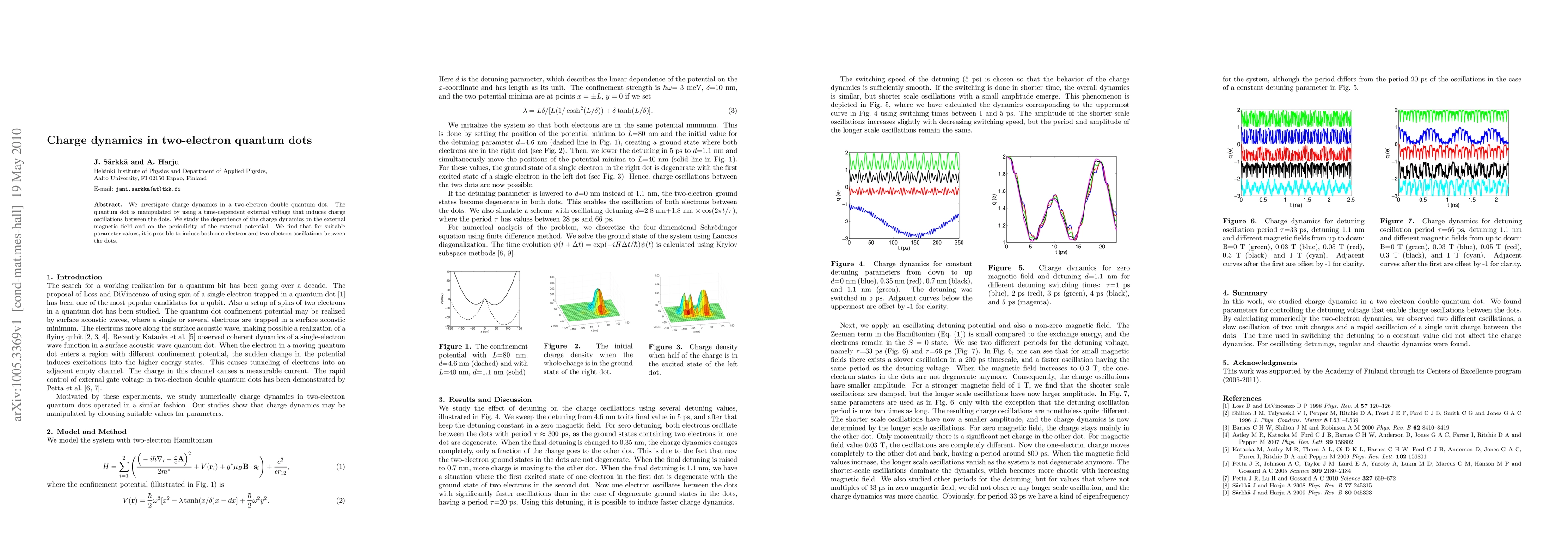 This study explores charge dynamics in a two-electron double quantum dot under a time-dependent external voltage, revealing oscillations influenced by external magnetic fields and potential periodicity. It demonstrates the potential for inducing both one-electron and two-electron oscillations under specific conditions.