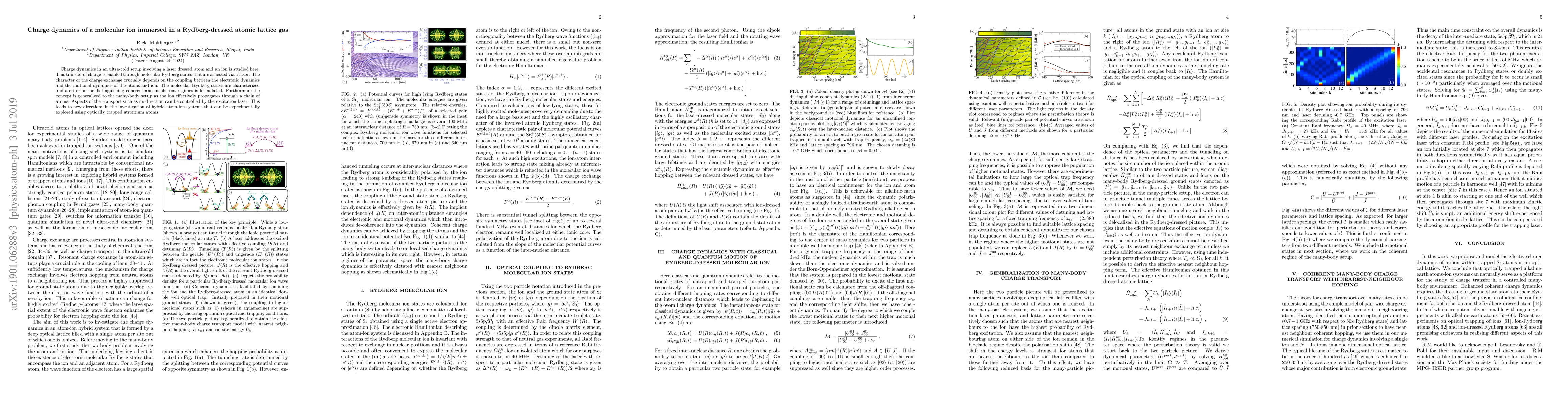 Charge dynamics in an ultra-cold setup involving a laser dressed atom and an ion is studied here. This transfer of charge is enabled through molecular Rydberg states that are accessed via a laser. The character of the charge exchange crucially depends on the coupling between the electronic dynamics and the vibrational motion of the atoms and ion. The molecular Rydberg states are characterized and a criterion for distinguishing coherent and incoherent regimes is formulated. Furthermore the concept is generalized to the many-body setup as the ion effectively propagates through a chain of atoms. Aspects of the transport such as its direction can be controlled by the excitation laser. This leads to new directions in the investigation of hybrid atom-ion systems that can be experimentally explored using optically trapped strontium atoms.