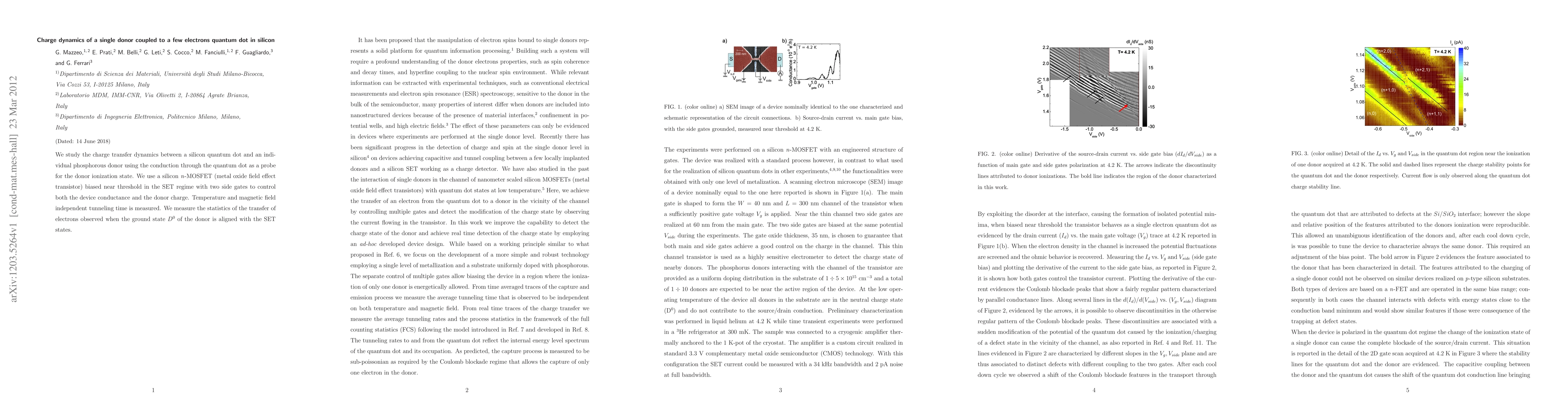 This paper investigates the charge dynamics between a silicon quantum dot and a single phosphorous donor in a silicon n-MOSFET, using tunneling time measurements to probe the donor's ionization state. The study reveals temperature and magnetic field independent tunneling times, providing insights into electron transfer statistics when the donor's ground state aligns with the SET states.