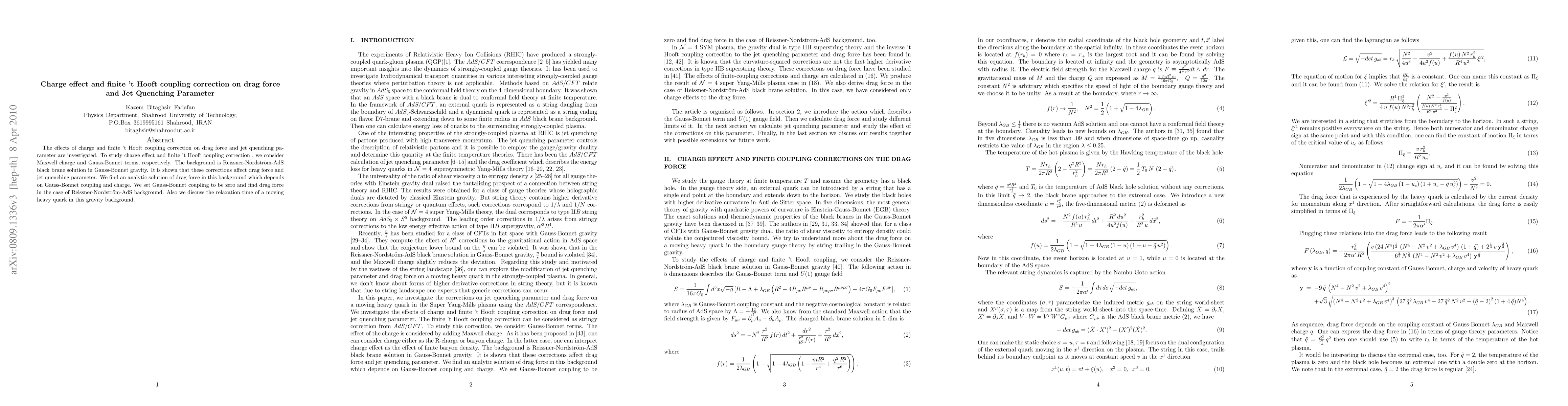 The effects of charge and finite 't Hooft coupling correction on drag force and jet quenching parameter are investigated. To study charge effect and finite 't Hooft coupling correction, we consider Maxwell charge and Gauss-Bonnet terms, respectively. The background is Reissner-Nordstr\"{o}m-AdS black brane solution in Gauss-Bonnet gravity. It is shown that these corrections affect drag force and jet quenching parameter. We find an analytic solution of drag force in this background which depends on Gauss-Bonnet coupling and charge. We set Gauss-Bonnet coupling to be zero and find drag force in the case of Reissner-Nordstr\"{o}m-AdS background. Also we discuss the relaxation time of a moving heavy quark in this gravity background.