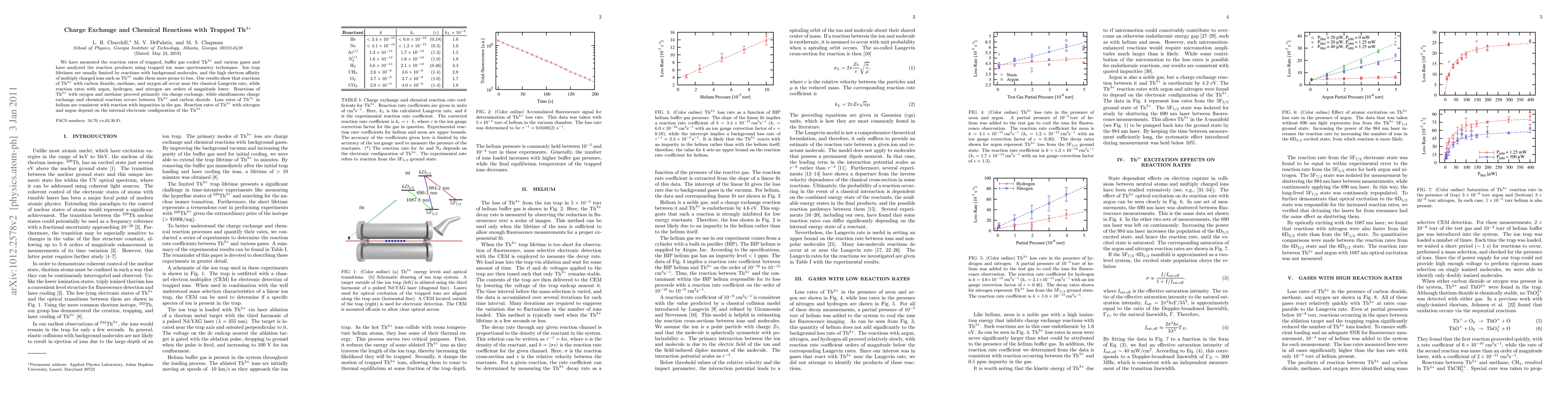 We have measured the reaction rates of trapped, buffer gas cooled Th$^{3+}$ and various gases and have analyzed the reaction products using trapped ion mass spectrometry techniques. Ion trap lifetimes are usually limited by reactions with background molecules, and the high electron affinity of multiply charged ions such as Th$^{3+}$ make them more prone to loss. Our results show that reactions of Th$^{3+}$ with carbon dioxide, methane, and oxygen all occur near the classical Langevin rate, while reaction rates with argon, hydrogen, and nitrogen are orders of magnitude lower. Reactions of Th$^{3+}$ with oxygen and methane proceed primarily via charge exchange, while simultaneous charge exchange and chemical reaction occurs between Th$^{3+}$ and carbon dioxide. Loss rates of Th$^{3+}$ in helium are consistent with reaction with impurities in the gas. Reaction rates of Th$^{3+}$ with nitrogen and argon depend on the internal electronic configuration of the Th$^{3+}$.