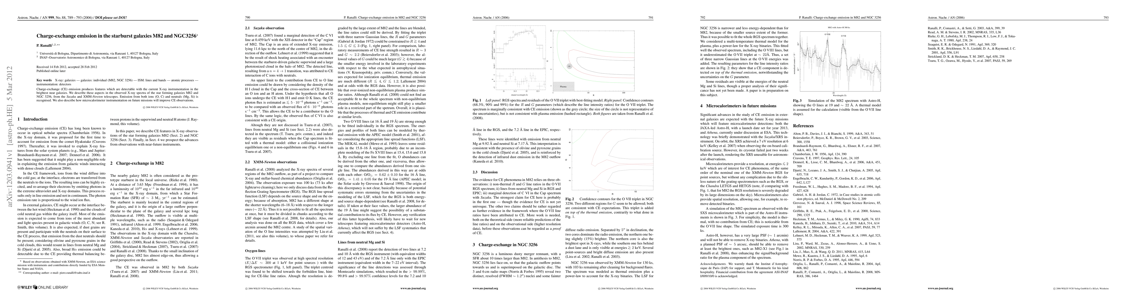This paper investigates charge-exchange emission in the starburst galaxies M82 and NGC3256 using data from Suzaku and XMM-Newton telescopes. The study identifies CE emission features from ions (O, C) and neutrals (Mg, Si) in their X-ray spectra, and discusses future enhancements with microcalorimeter instrumentation.