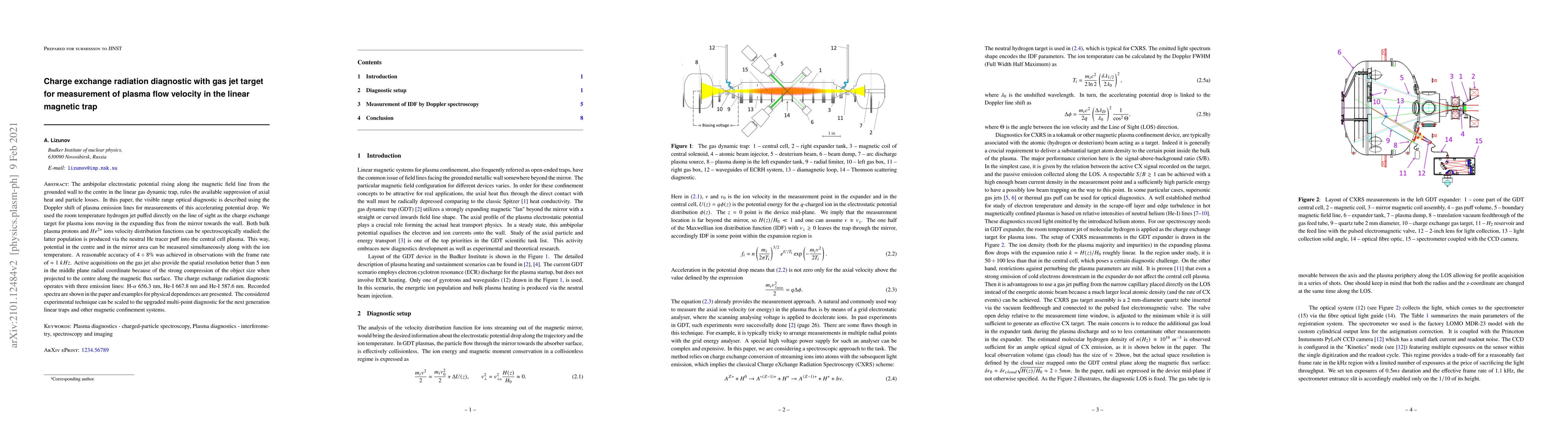 The ambipolar electrostatic potential rising along the magnetic field line from the grounded wall to the centre in the linear gas dynamic trap, rules the available suppression of axial heat and particle losses. In this paper, the visible range optical diagnostic is described using the Doppler shift of plasma emission lines for measurements of this accelerating potential drop. We used the room temperature hydrogen jet puffed directly on the line of sight as the charge exchange target for plasma ions moving in the expanding flux from the mirror towards the wall. Both bulk plasma protons and $He^{2+}$ ions velocity distribution functions can be spectroscopically studied; the latter population is produced via the neutral He tracer puff into the central cell plasma. This way, potential in the centre and in the mirror area can be measured simultaneously along with the ion temperature. A reasonable accuracy of $4\div8\%$ was achieved in observations with the frame rate of $\approx 1~kHz$. Active acquisitions on the gas jet also provide the spatial resolution better than 5~mm in the middle plane radial coordinate because of the strong compression of the object size when projected to the centre along the magnetic flux surface. The charge exchange radiation diagnostic operates with three emission lines: H-$\alpha$ 656.3~nm, He-I 667.8~nm and He-I 587.6~nm. Recorded spectra are shown in the paper and examples for physical dependences are presented. The considered experimental technique can be scaled to the upgraded multi-point diagnostic for the next generation linear traps and other magnetic confinement systems.