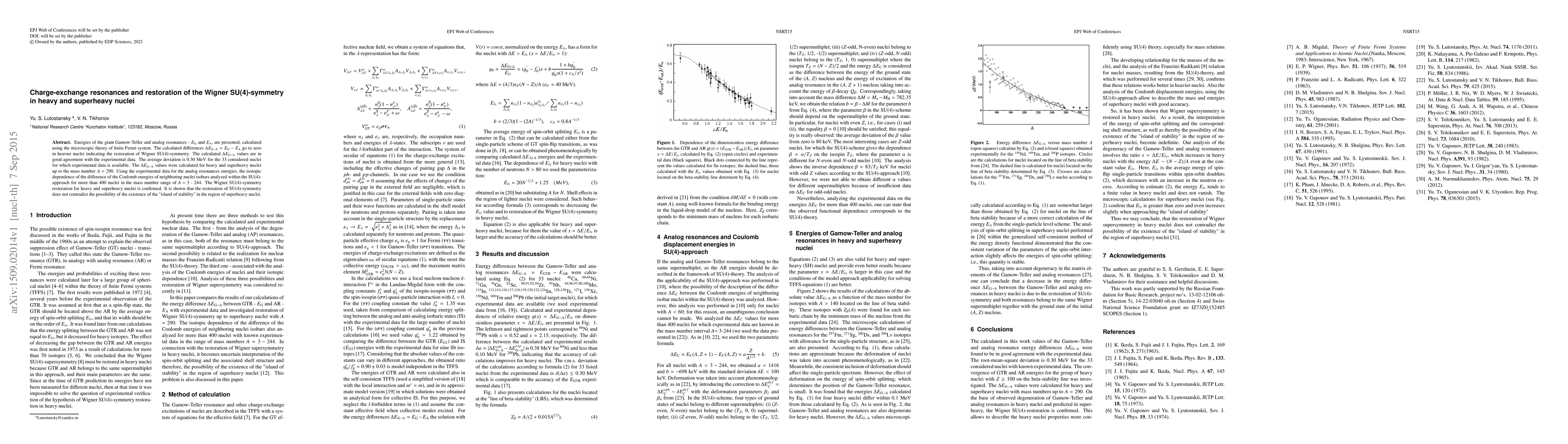 Energies of the giant Gamow-Teller and analog resonances - $E_{\rm G}$ and $E_{\rm A}$, are presented, calculated using the microscopic theory of finite Fermi system. The calculated differences $\Delta E_{\rm G-A}=E_{\rm G}-E_{\rm A}$ go to zero in heavier nuclei indicating the restoration of Wigner SU(4)-symmetry. The calculated $\Delta E_{\rm G-A}$ values are in good agreement with the experimental data. The average deviation is 0.30 MeV for the 33 considered nuclei for which experimental data is available. The $\Delta E_{\rm G-A}$ values were calculated for heavy and superheavy nuclei up to the mass number $A $= 290. Using the experimental data for the analog resonances energies, the isotopic dependence of the difference of the Coulomb energies of neighboring nuclei isobars analyzed within the SU(4)-approach for more than 400 nuclei in the mass number range of $A$ = 3 - 244. The Wigner SU(4)-symmetry restoration for heavy and superheavy nuclei is confirmed. It is shown that the restoration of SU(4)-symmetry does not contradict the possibility of the existence of the "island of stability" in the region of superheavy nuclei.